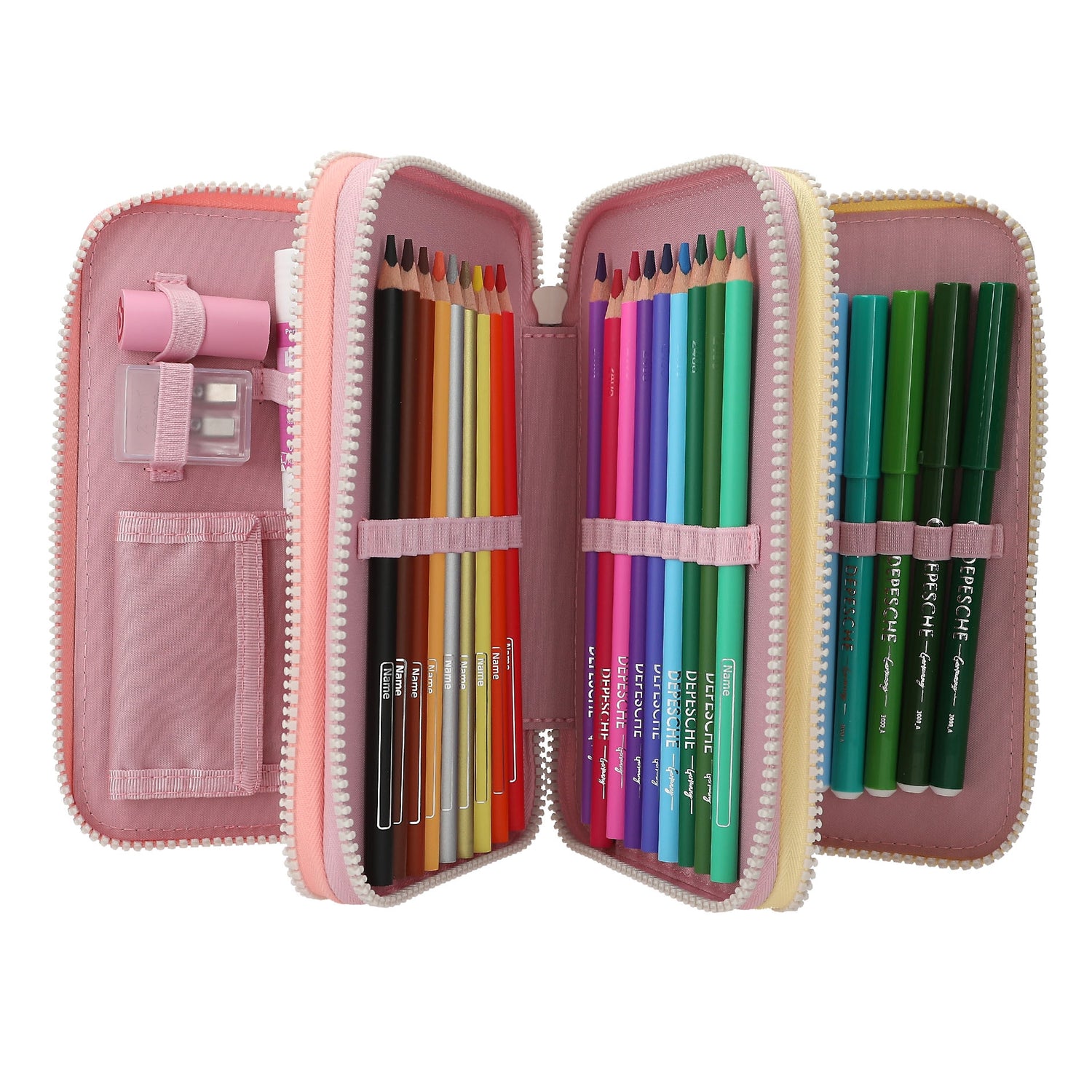 Noch farbenfroher wird es durch die drei verschiedenfarbigen Reißverschlussbänder. Gefüllt ist die 3-Fach-Federtasche mit je 18 Bunt- und Filzstiften,