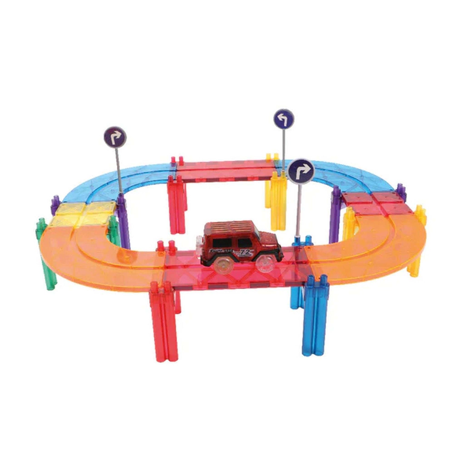 Mit dem tollen Bausatz in knalligen Farben baut Ihr Kind auf verschiedenen Ebenen die coolsten Rennstrecken. Für besonderen Spielspaß werden Verkehrsschilder, ein Auto und Pfeiler mitgeliefert.
