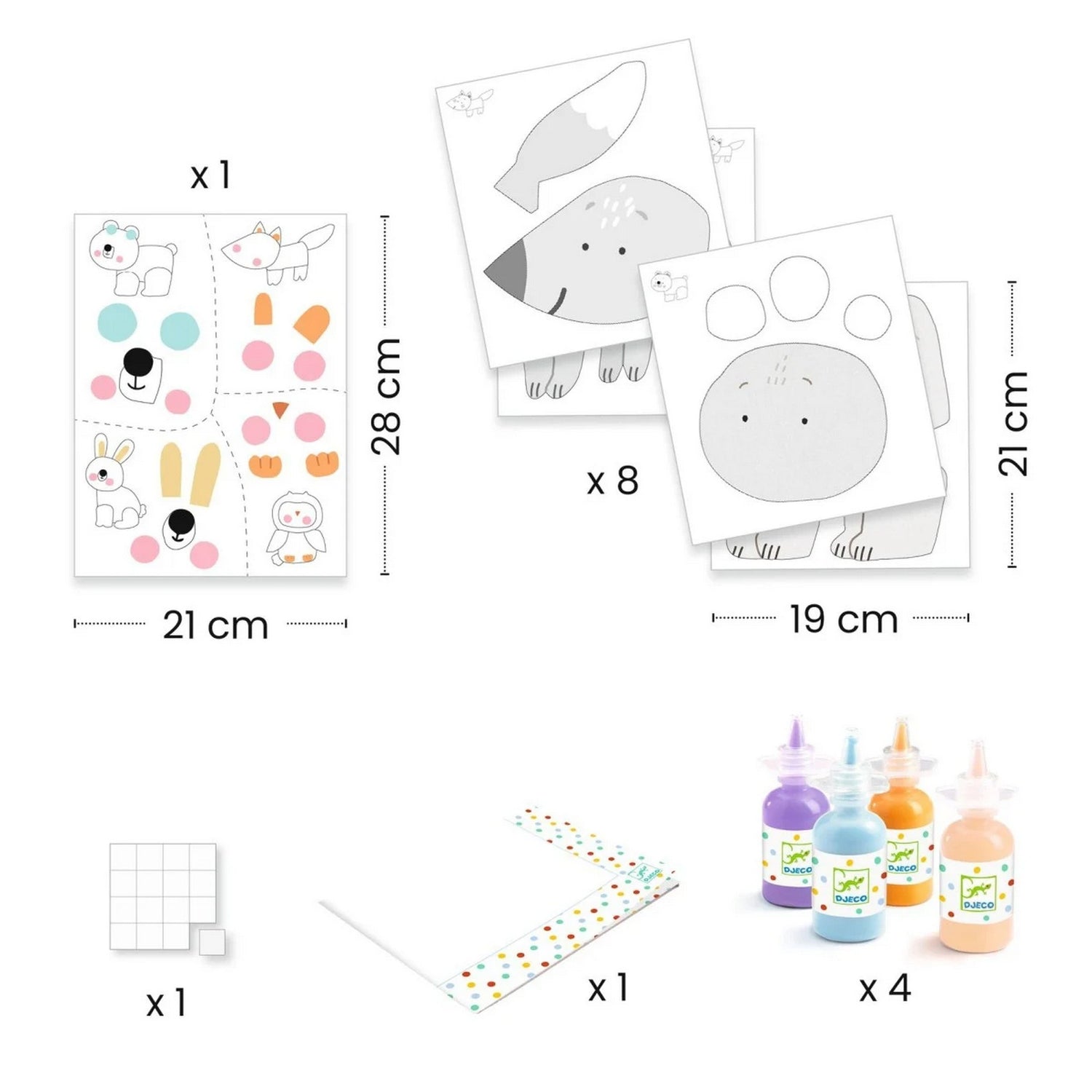 Das Malset enthält 8 dicke, vorgeschnittene und illustrierte Pappkarten, einen Stickerbogen, 4 Behälter mit Fingerfarbe, eine Tischabdeckung und eine Anleitung. Die Verpackungsgröße beträgt 23 x 29,7 x 4,8 cm, was das Set leicht zu verstauen und zu transportieren macht.