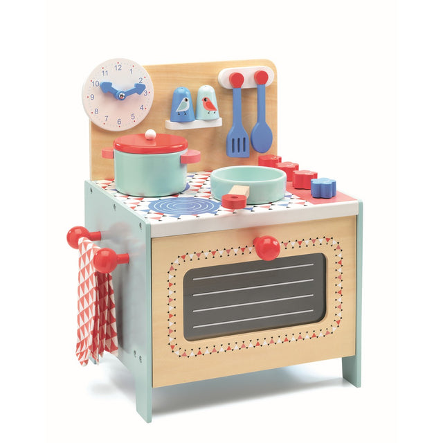 Die Kinderküche von Djeco in neutralem Design mit viel sichtbarem Holz für Kinder ab 3 Jahren lassen Kinderherzen höher schlagen. Dieser kleine Herd von Djeco ist ideal für kleine Küchenchefs! Der Herd hat 3 Herdplatten und einen Backofen. Außerdem gibt es ein kleines Regal für den Salz- und Pfefferstreuer, eine Aufhängung für Küchenutensilien, eine Uhr und ein Geschirrtücher mit Aufhängung. Natürlich dürfen auch ein Topf und eine Pfanne nicht fehlen. Die Backofentür ist magnetisch. Fördert Ihrem Kind die Motorik, Fantasie und ist gleichzeitig ein Rollenspiel für die kleinen, damit sie beim Kochen genauso viel Spaß haben wie die Großen!