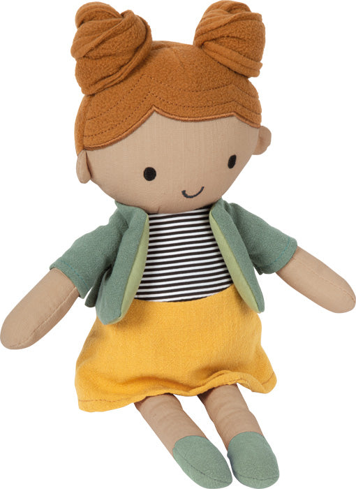 Eine Freundin für alle Spielmomente. Stoffpuppen wie „Maya“ von small foot nehmen im kindlichen Spiel eine ganz besondere Rolle ein: Sie sind Zuhörerin, Spielkameradin, Trostspenderin und Fantasiebegleiterin zugleich. Durch ihre weiche, anschmiegsame Art fühlt sie sich vertraut an wie ein Kuscheltier – der formstabile Körper macht sie gleichzeitig zur idealen Begleiterin für kreatives Rollenspiel. Beim Nachahmen von Alltagssituationen verarbeiten Kinder ihre Erlebnisse, drücken Gefühle aus und entwickeln soziale Kompetenzen. „Maya“ trägt einen sonnengelben Rock, ein gestreiftes Oberteil und eine abnehmbare Jacke, die sich spielend leicht an- und ausziehen lässt. Das fördert nicht nur die Feinmotorik, sondern macht auch Lust darauf, sich mit Kleidung und Selbstständigkeit auseinanderzusetzen. Pflegeleicht und langlebig begleitet „Maya“ Kinder durch viele Spielstunden – und bleibt dank Handwäsche hygienisch und formstabil. Modell: 12779 Gewicht: ca. 0,13 kg Material: Plüsch, Stoff Maße: 28 × 8 × 39 cm Altersempfehlung: ab 0 Monaten Kompetenzthemen: Fantasie & Kreativität, soziale & emotionale Entwicklung Warnhinweis: Vor Gebrauch alle Verpackungsmaterialien entfernen. Hinweise aufbewahren.