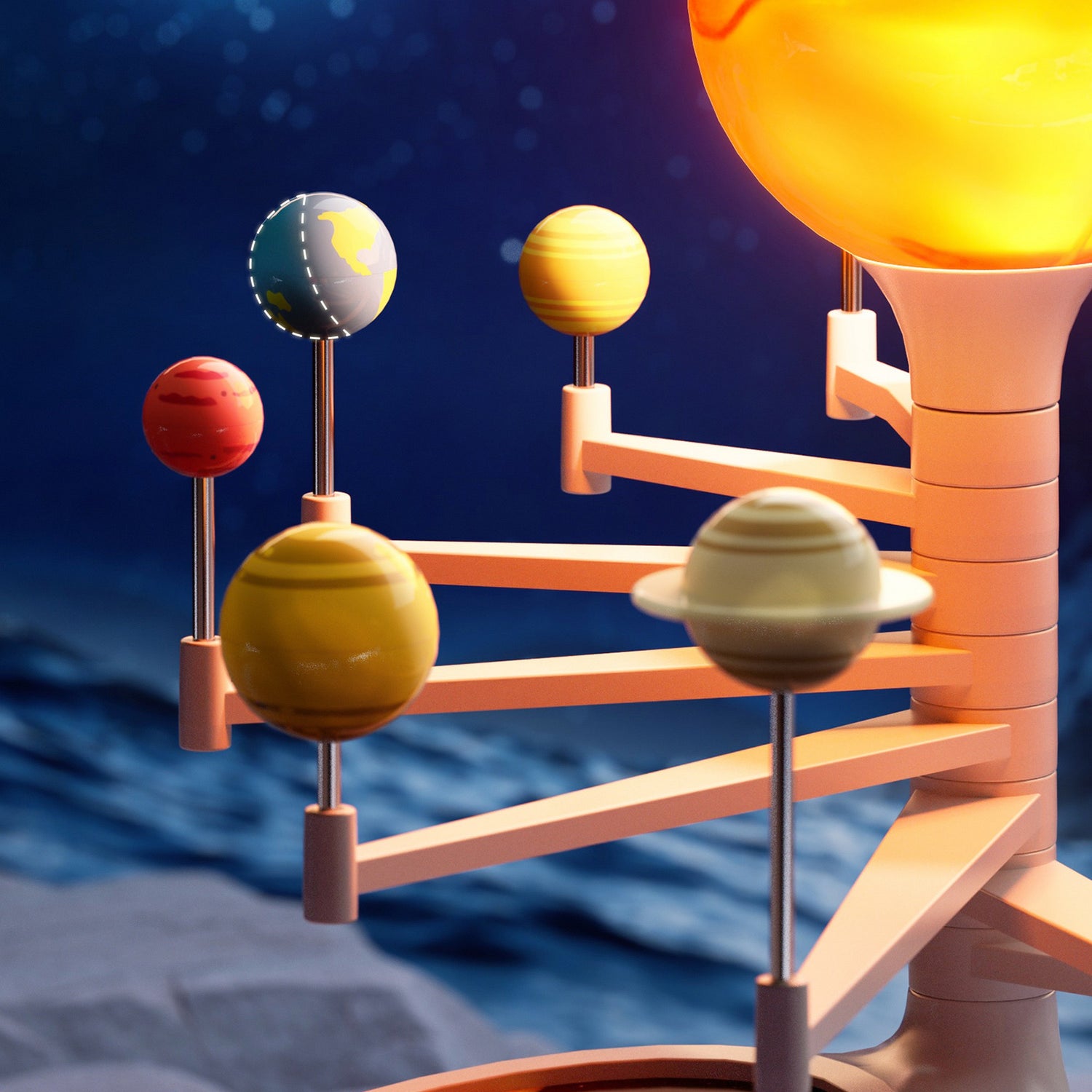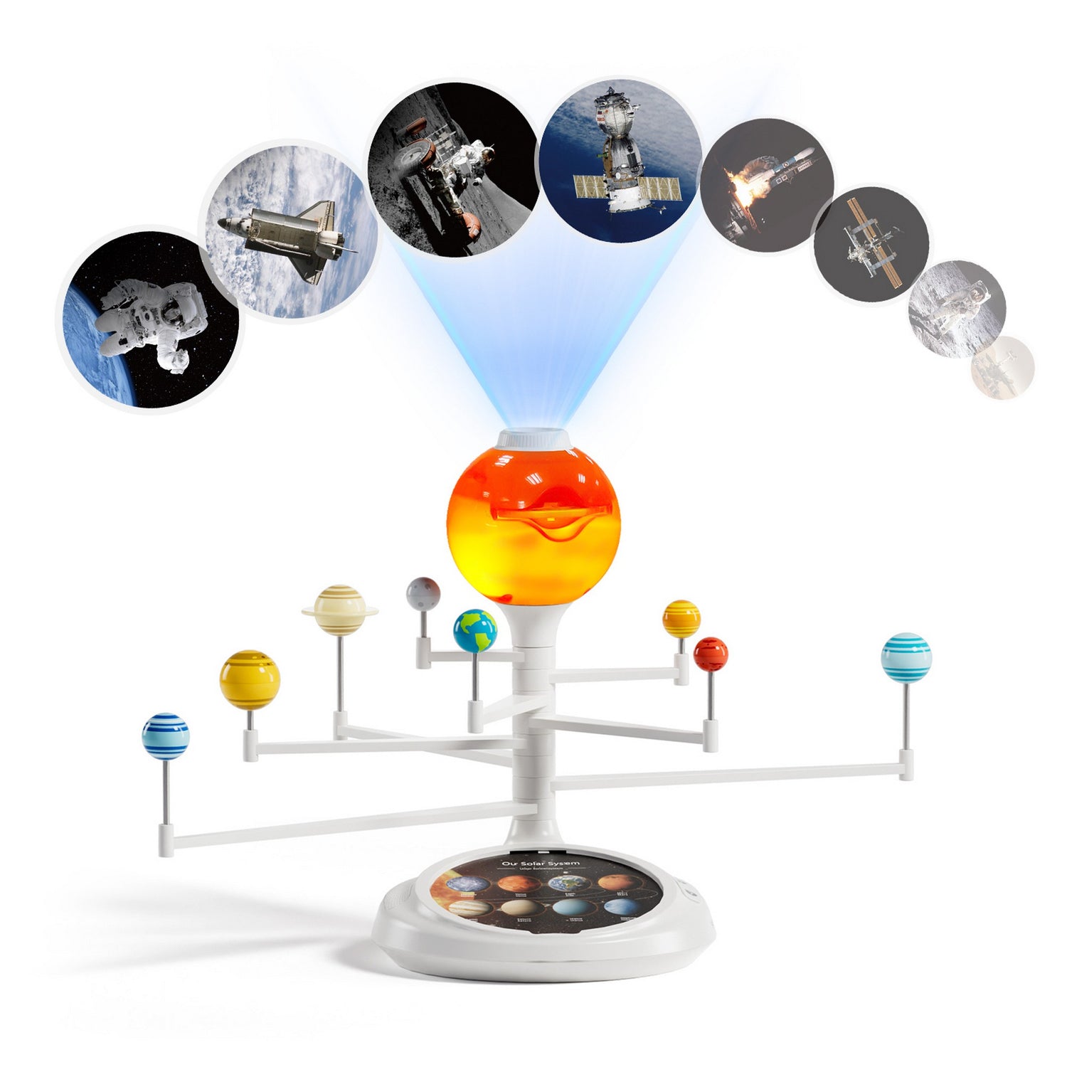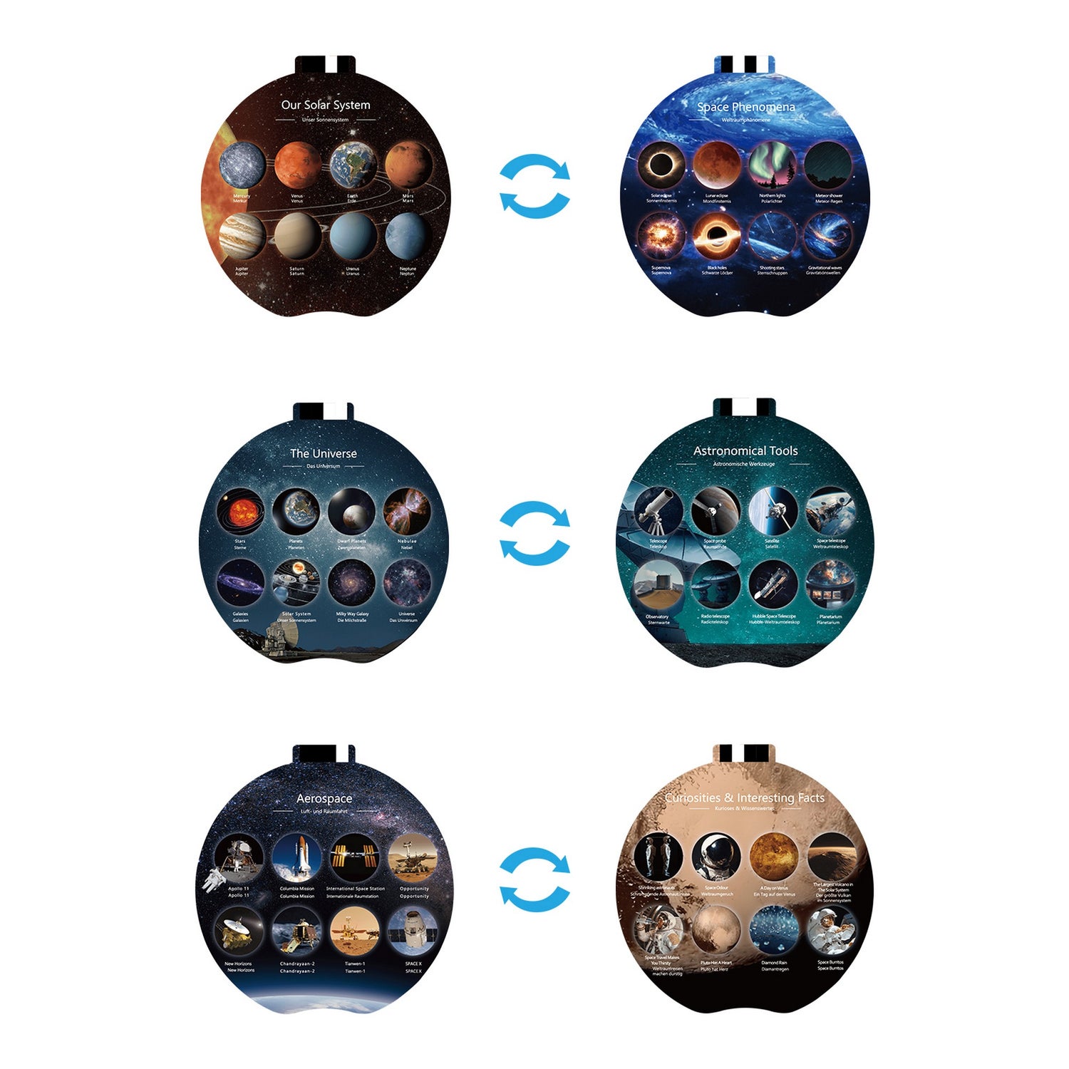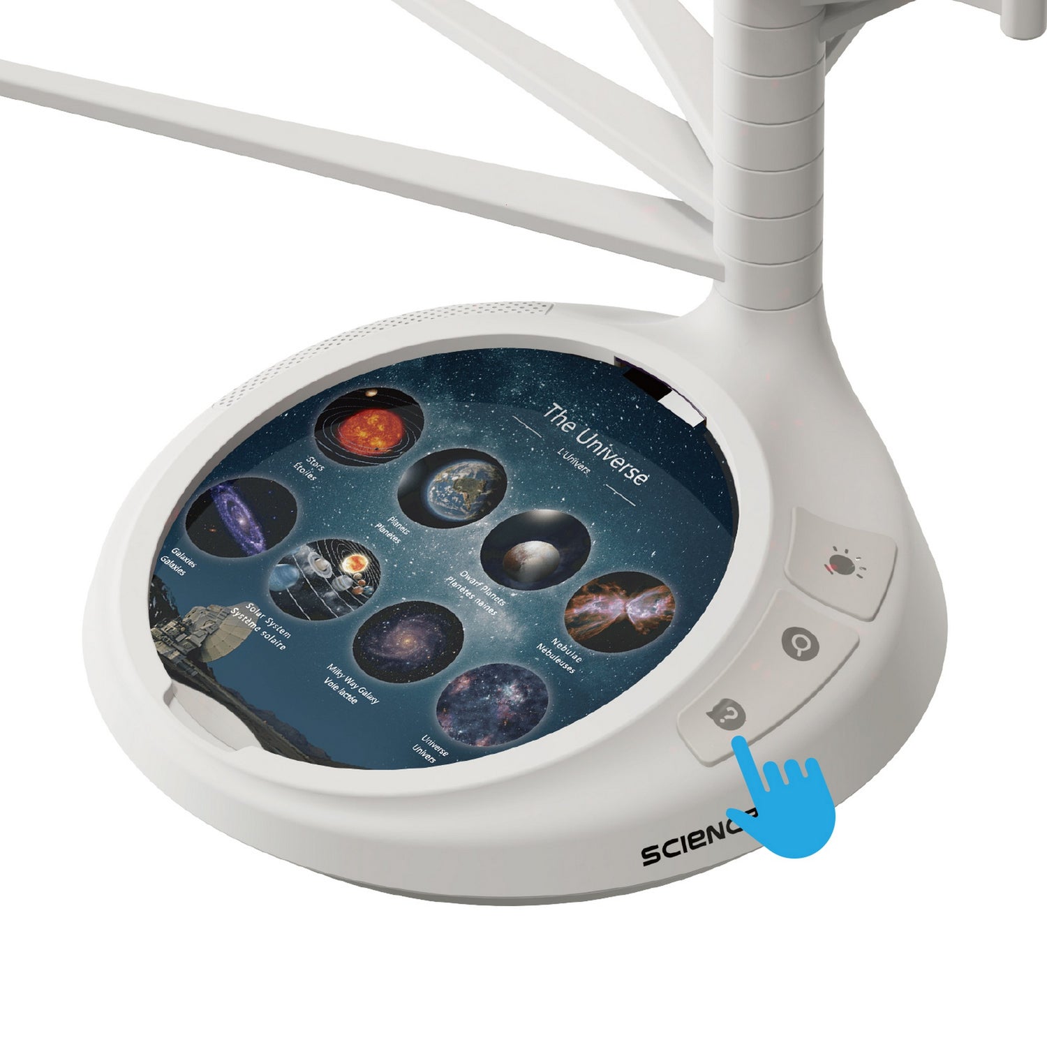 Die Planeten sind realistisch gestaltet und lassen sich über die Symbolfelder am Sockel auswählen. Die leuchtende Sonne dient gleichzeitig als Projektor: Drei Bildscheiben mit insgesamt 24 Weltraummotiven bringen den Sternenhimmel direkt an die Decke – für leuchtende Augen und jede Menge Aha-Momente.