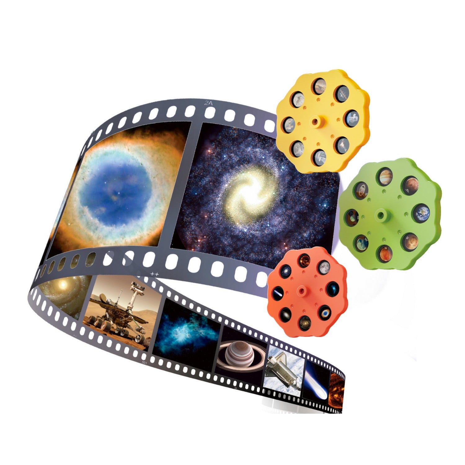 Lieferumfang: 1 Planetarium mit Projektor, 3 Bildscheiben mit je 8 Motiven