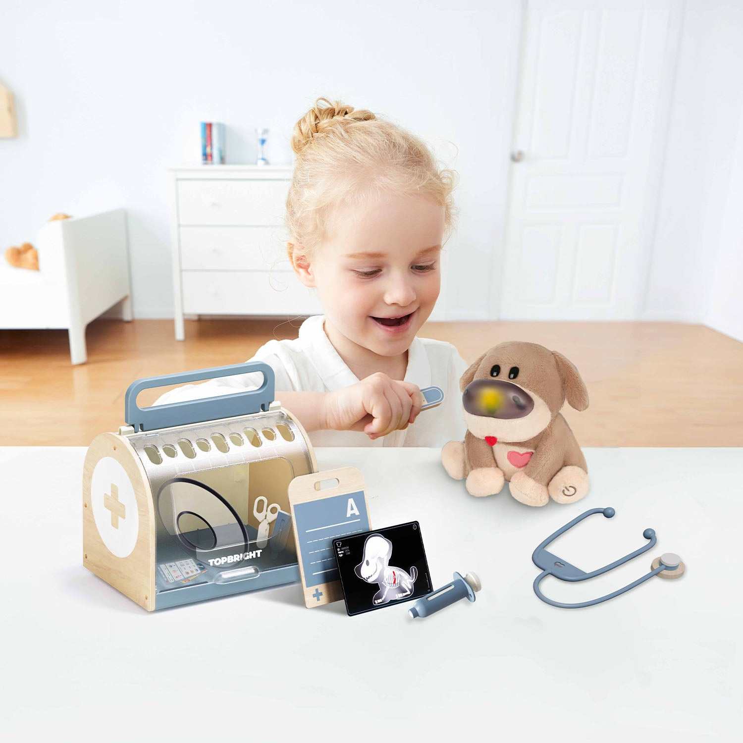Lieferumfang: Interaktiver Plüschwelpe mit leuchtender Nase, Holz-Arztbox, Stethoskop, Spritze, Spielpille, Pflaster, Thermometer, Hundehalskrause, Holz-Klemmbrett, Schere, 3 Röntgenkarten, Diagnosekarte
