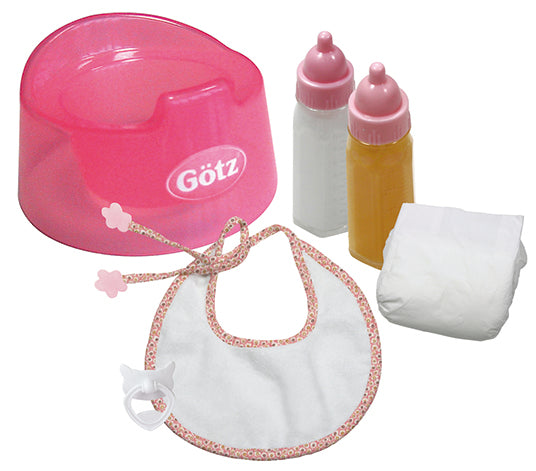 Das Set besteht aus: Töpfchen, zwei Windeln, zwei Schnuller, Lätzchen, Saftflasche, Milchflasche.