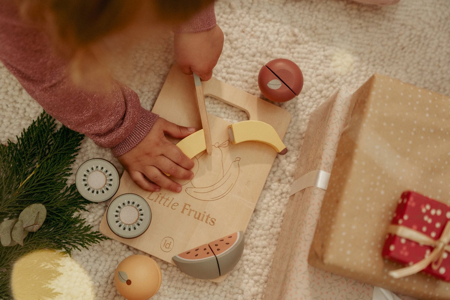 Jedes Obststück lässt sich mit dem beiliegenden Holzmesser in zwei Hälften teilen. Klettverschlüsse sorgen dafür, dass die Teile nach dem Schneiden ganz einfach wieder zusammengesetzt werden können. So werden motorische Fähigkeiten, Hand-Auge-Koordination und das Verständnis für Lebensmittel gefördert – ideal für Rollenspiele in der Spielküche.