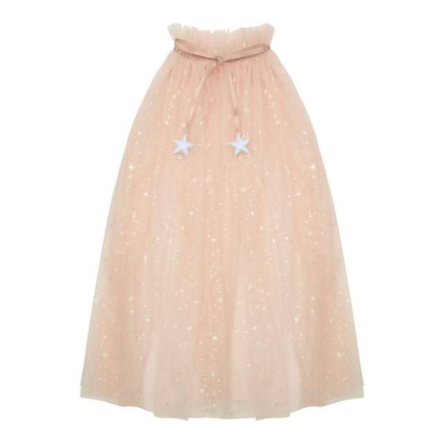 Der Umhang ist rosa mit Glitzer und Sternen versehen. Für den sicheren Verschluss sorgt ein Druckknopf mit Satinschleife mit glitzernden Goldsternen.