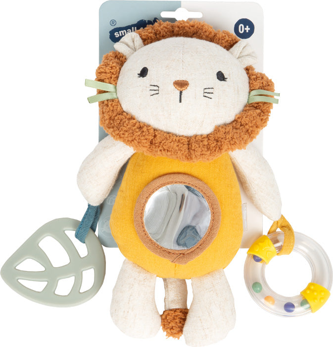 Verschiedene Materialien, spannende Texturen und ein integriertes Rasselgeräusch fördern spielerisch das Hören und Entdecken. Beim Zahnen bietet der Beißring wohltuende Unterstützung und sorgt für zusätzliche Erleichterung. Dank der praktischen Aufhängung begleitet der kleine Löwe Babys zuverlässig im Kinderwagen, in der Babyschale oder unterwegs – stets bereit zum Trösten, Spielen und Kuscheln. Ein harmonischer Begleiter, der Funktionalität und Herz perfekt verbindet.