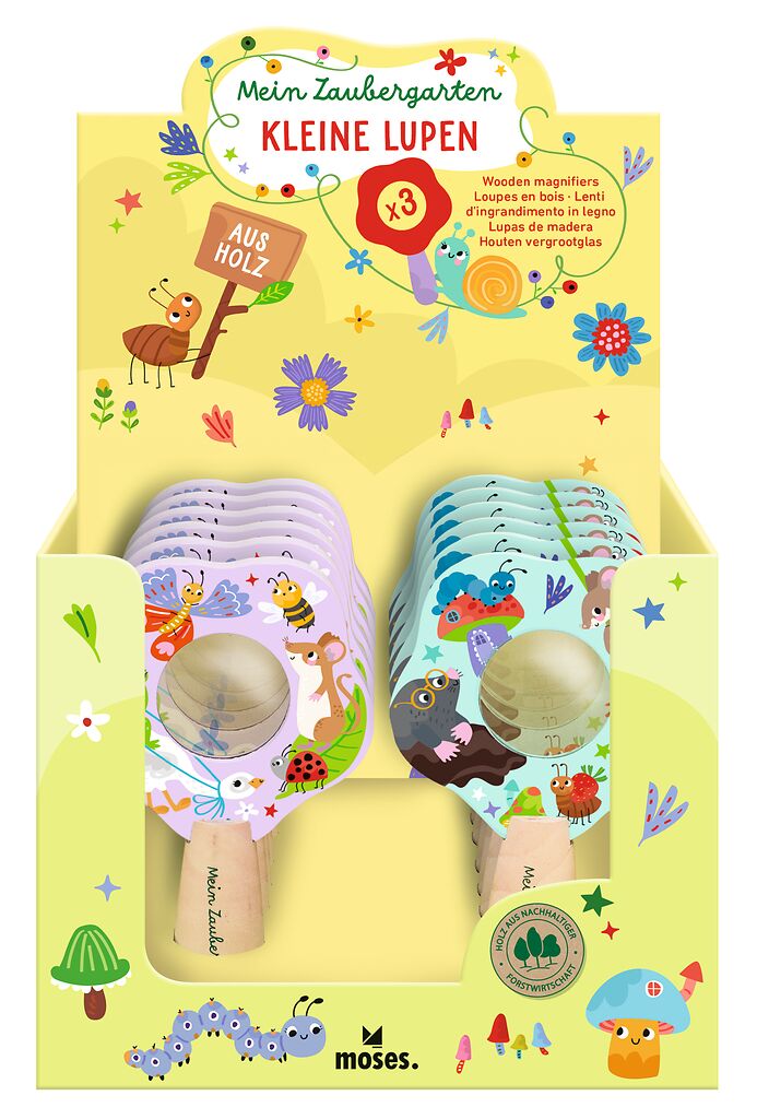 Mit den farbenfrohen Lupen wird jeder Spaziergang zur Entdeckungstour. Ob Käfer, Blätter oder bunte Blüten – durch die 3-fache Vergrößerung lässt sich alles ganz genau betrachten. Die Holzlupe liegt gut in kleinen Händen und zeigt mit ihren fröhlichen Illustrationen, wie spannend die Natur direkt vor der Haustür sein kann.