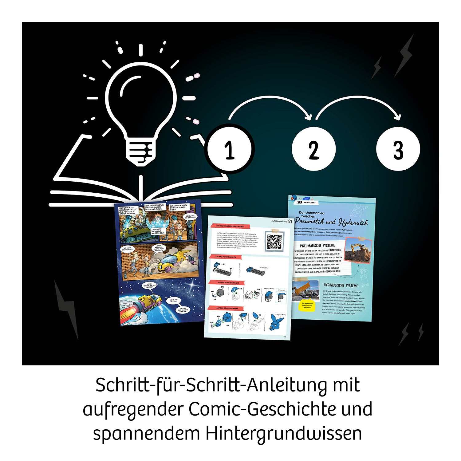 Inhalt: Bausatz für 2 Roboter, Hydrauliksystem, farbig illustrierte Anleitung