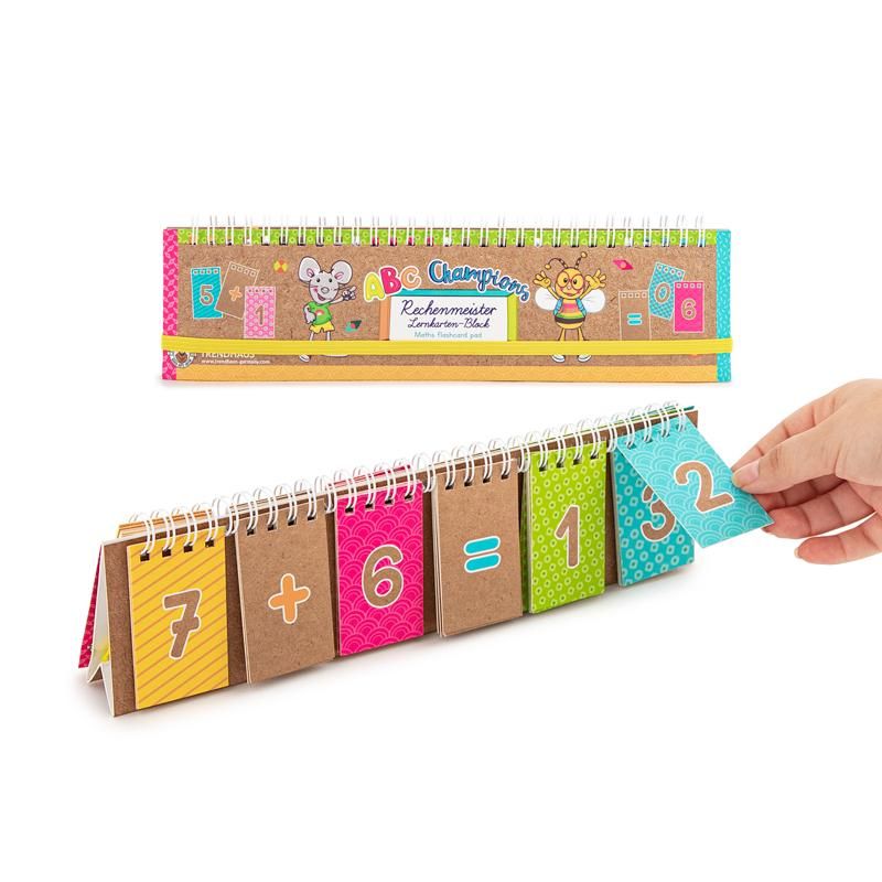 Mit dem Rechenmeister Lernkarten-Block von Trendhaus macht Rechnen Spaß ! Egal ob addieren, subtrahieren, multiplizieren oder dividieren - mit diesem Lernkarten-Block zum Aufstellen aus stabilen Karton mit Spiralbindung können Kinder die Grundrechenarten spielend leicht lernen und fleißig üben. Durch das Umblättern der Kärtchen ergeben sich immer wieder neue Rechenaufgaben, die es zu lösen gilt. Fertig? Dann einfach mit dem praktischen Gummibandverschluss verschließen und einpacken. Das perfekte Geschenk für kleine Rechenmeister und die, die es werden wollen.