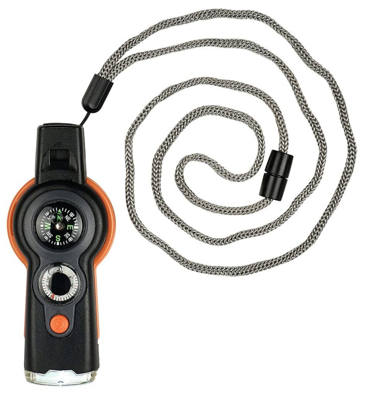 Eine leistungsstarke LED-Taschenlampe, Signalpfeife, Kompass, Thermometer, Lupe mit 2-facher Vergrößerung, Spiegel plus ein abnehmbares Band.