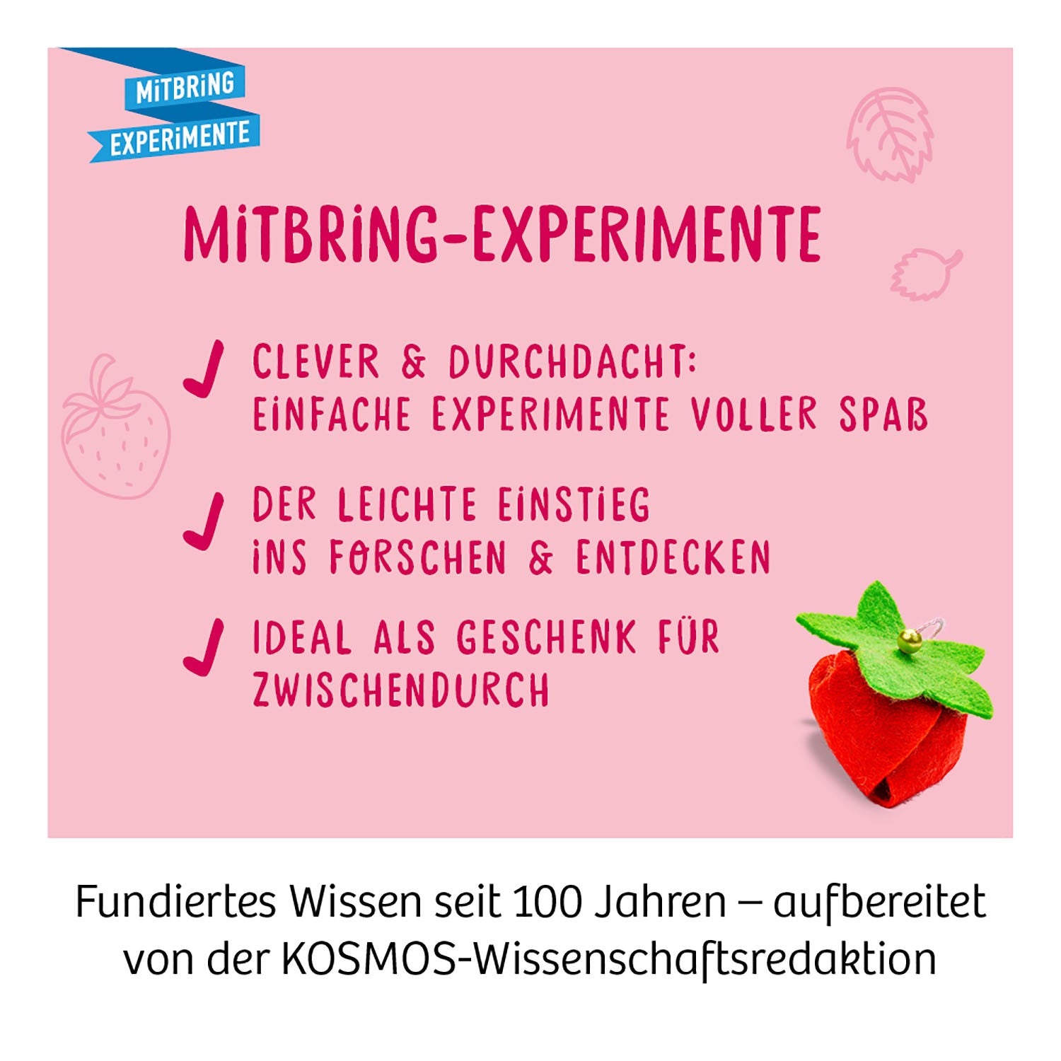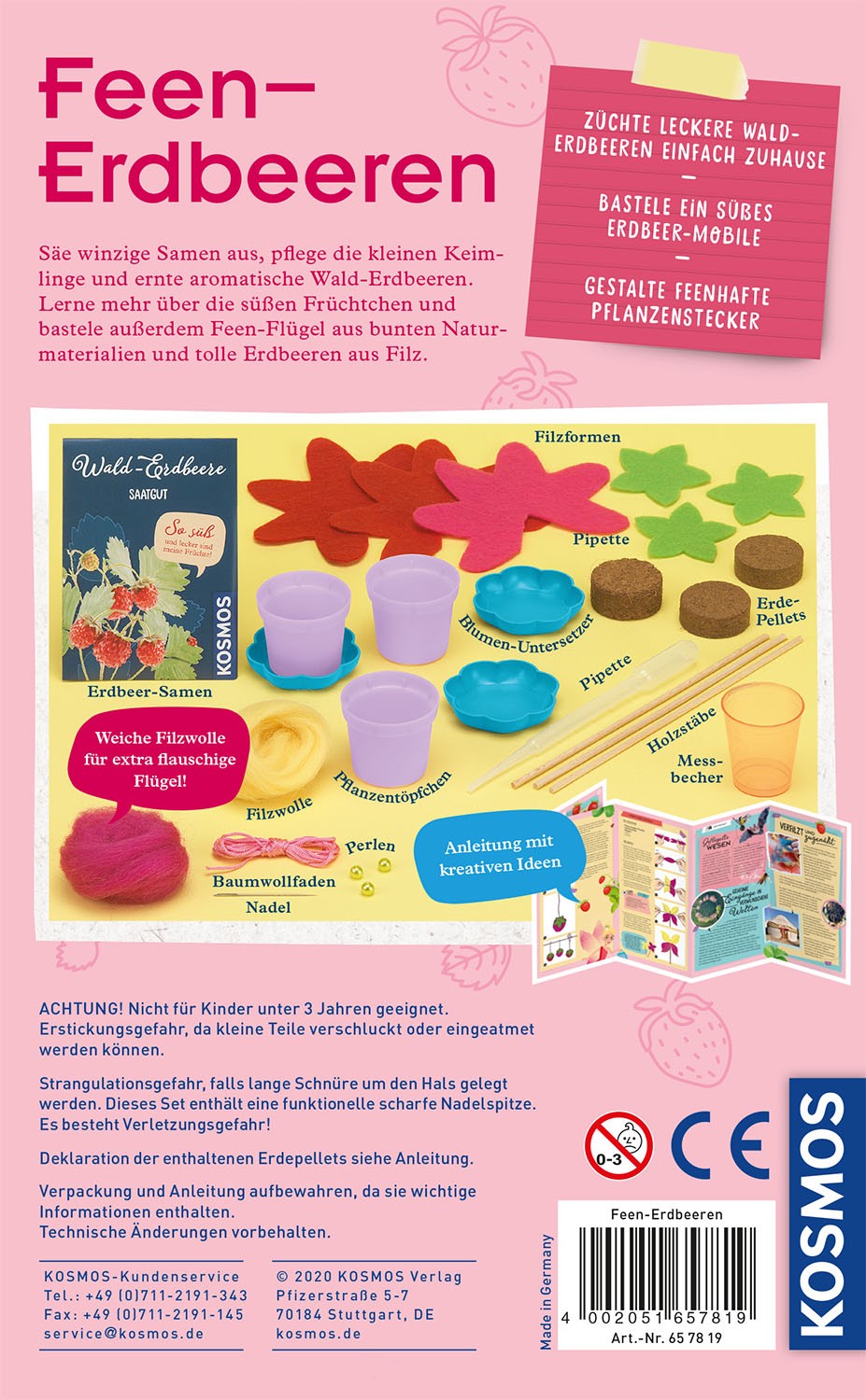 Mit diesem Experimentierset von KOSMOS züchten kleine Gärtnerinnen und Gärtner ab 6 Jahren ihre ersten süßen Früchte und gestalten niedliche Feen-Dekorationen. Wie das funktioniert? Von der Aussaat, über die Pflege bis hin zur Ernte – die farbig gestaltete Anleitung zeigt den Kindern ganz genau, was mit Samen, Erde-Pellets und Töpfchen zu tun ist. Und während sie dann die kleinen Walderdbeeren Tag für Tag beim Wachsen und Gedeihen beobachten können, vertreiben sich die Kinder die Zeit mit dem zauberhaften Bastelmaterial. Einfach die Filzzuschnitte zu hübschen kleinen Erdbeeren zusammenfügen und aus diesen ein Mobile gestalten oder die Wolle in zarte Feenflügel verwandeln, die als Pflanzenstecker die Töpfchen schmücken – fertig ist das kleine Paradies für Feen.
