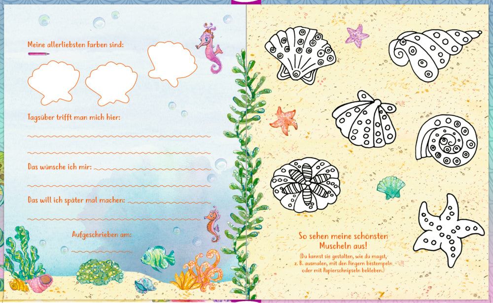 In dieses fröhlich-bunte Buch können sich kleine Meerjungfrauen und ihre Freundinnen und Freunde eintragen.