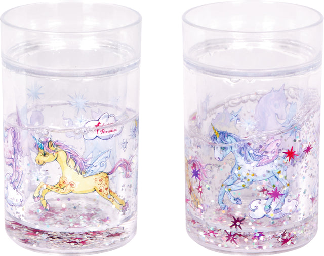 Die Doppelwand ist gefüllt mit schwimmenden Glitzerpartikeln und Einhornmotiven, die im Licht funkeln.