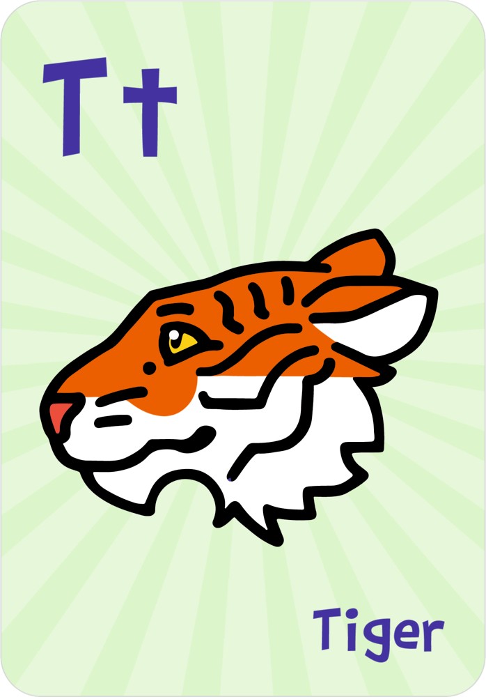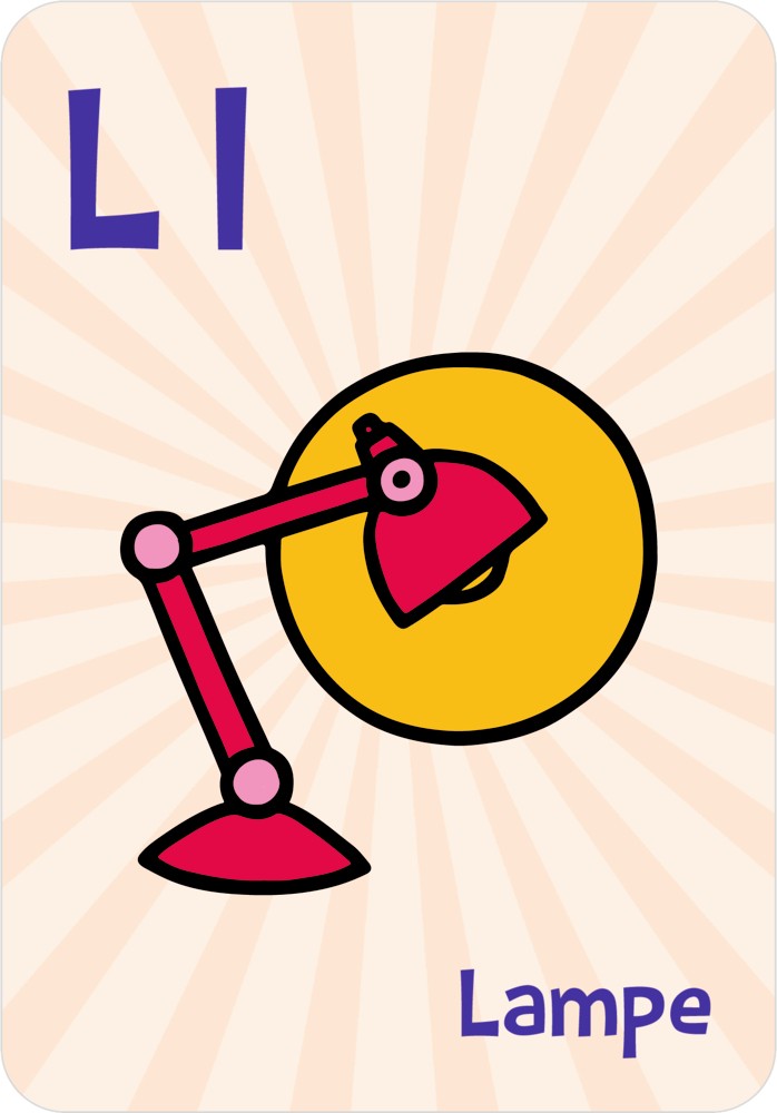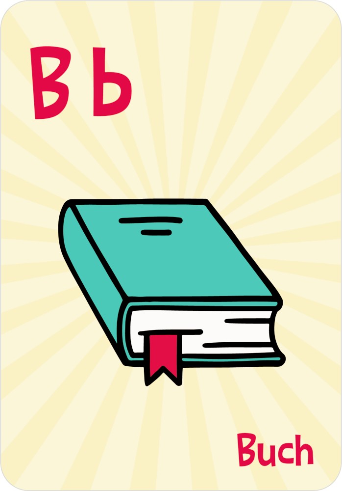 Die Vorderseite zeigt ein buntes Bild passend zu dem Buchstaben, auf der Rückseite ist Platz für Schreibübungen.