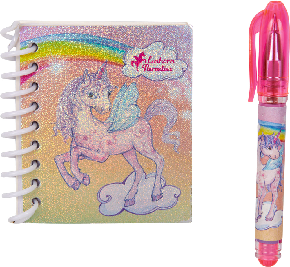 Dieses Schreibset von Coppenrath besteht aus einem Gelstift und einem Notizheft mit Einhorn- Motiv und ist liebevoll in einer kleinen Tasche in Regenbogen-Optik verpackt.