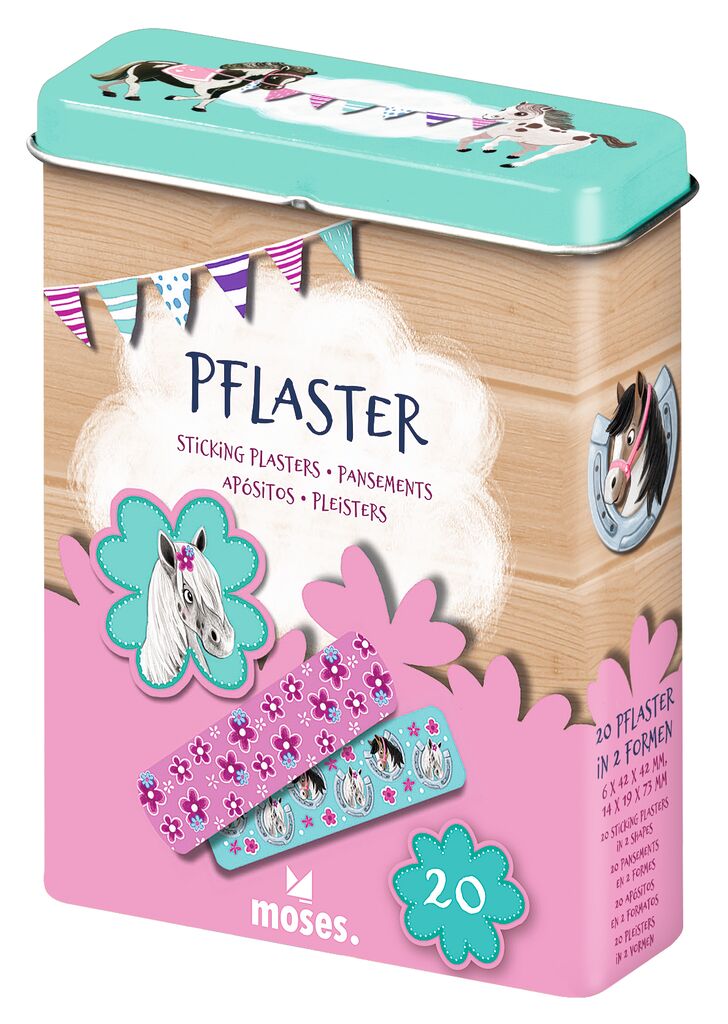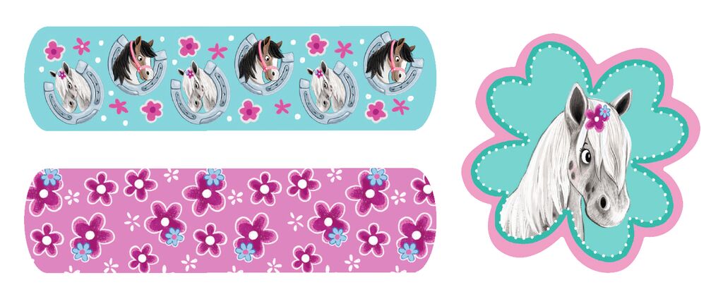 Die Pflasterdose enthält 20 sterile, elastische und luftdurchlässige Pflaster mit drei verschiedenen Formen mit Pferdemotiven.