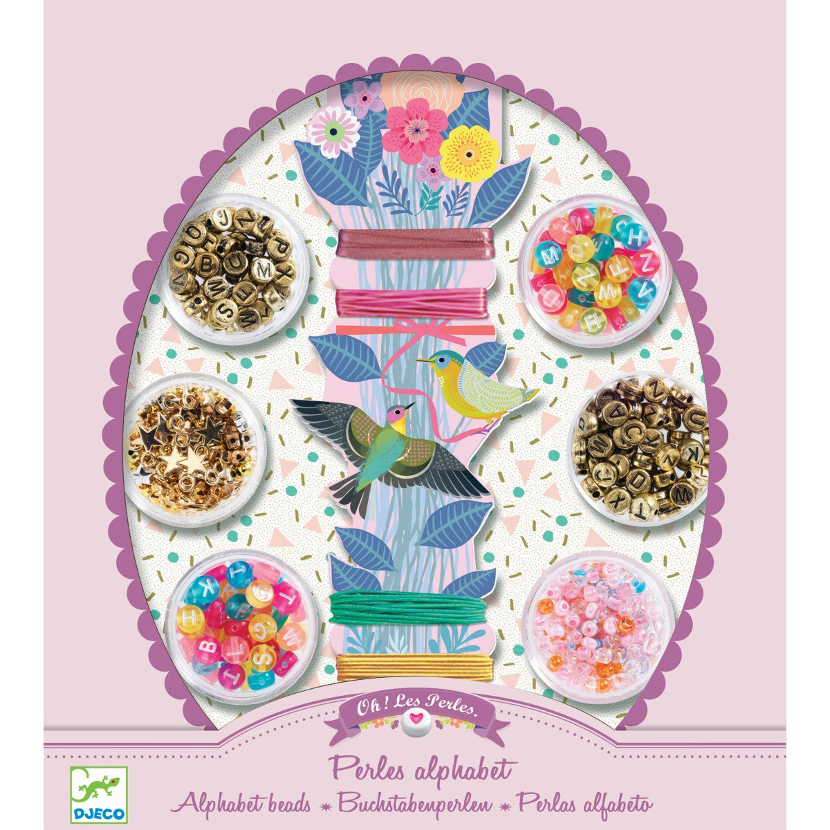 Das Djeco Schmuck-Bastelset "Buchstaben" enthält alles hübsche Zubehör, welches zum Auffädeln von hübschen Hals- oder Armbändchen benötigt wird.