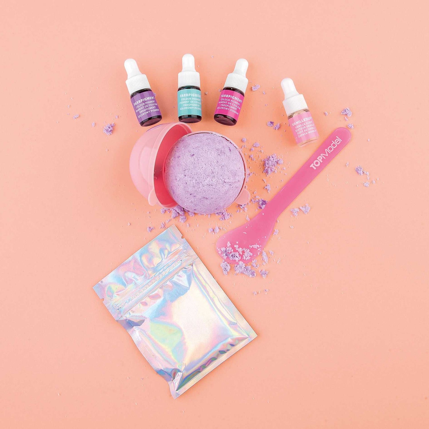 Mit anschaulicher Anleitung. Inhaltsmengen: Vanille-Duft 2,6 ml; Farbpigmente Pink, Lila, Türkis je 2,6 ml; Mix-Pulver 50 g; Natriumbicarbonat 30 g;