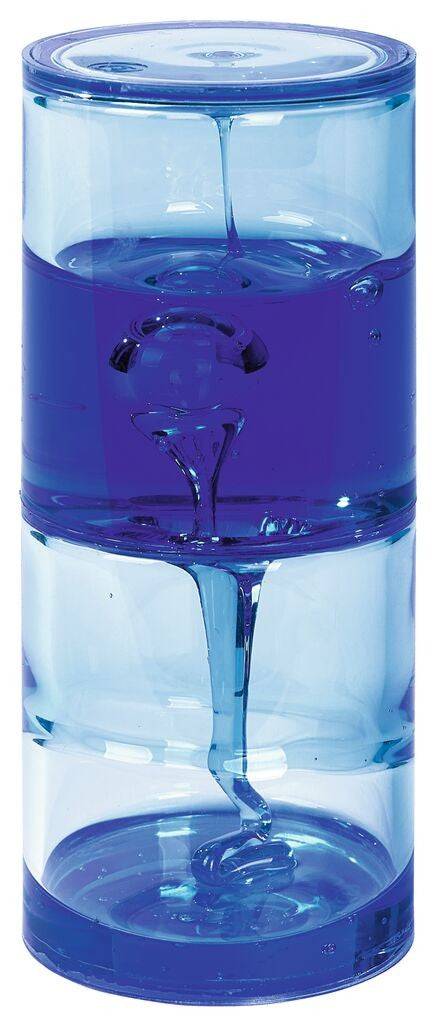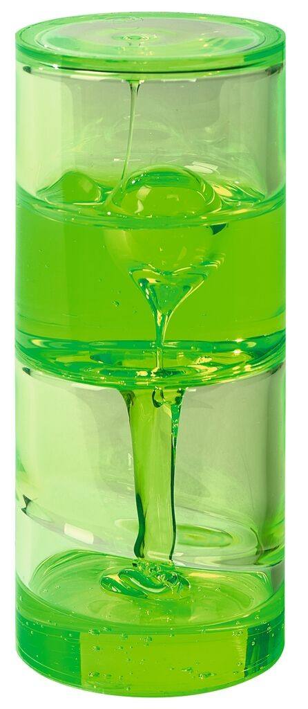 Dreht man das sanduhrförmige Gehäuse um, so verrinnt die Zeit in Form von Tropfen, die zu Boden sinken. Durch den Austausch der beiden sich abweisenden Flüssigkeiten steigen Blubberblasen nach oben, ein faszinierendes Schauspiel.