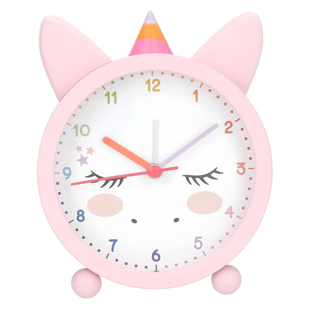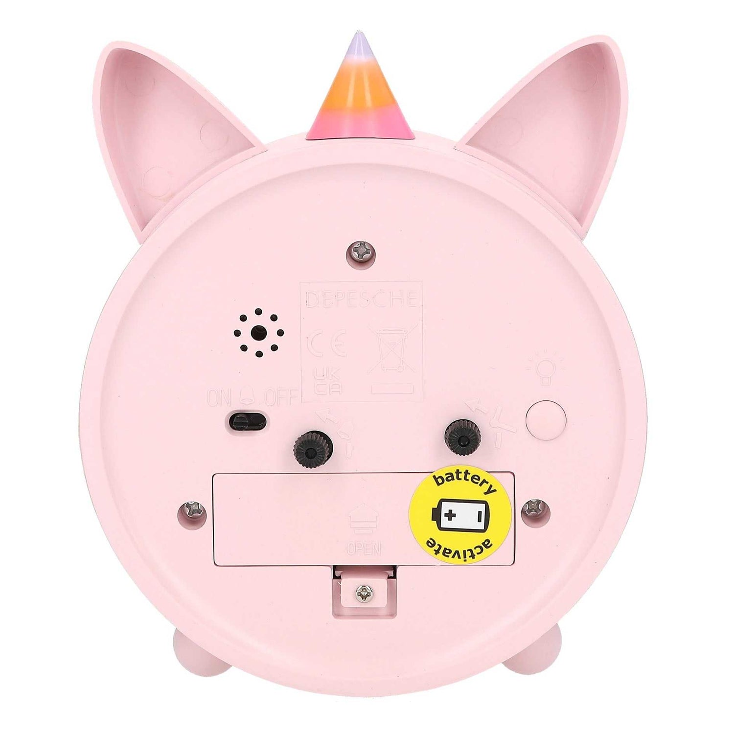 Zeit für den niedlichsten Einhorn-Wecker aller Zeiten: Das rosafarbene Gehäuse hat zwei Öhrchen und ein farbenfrohes Horn.