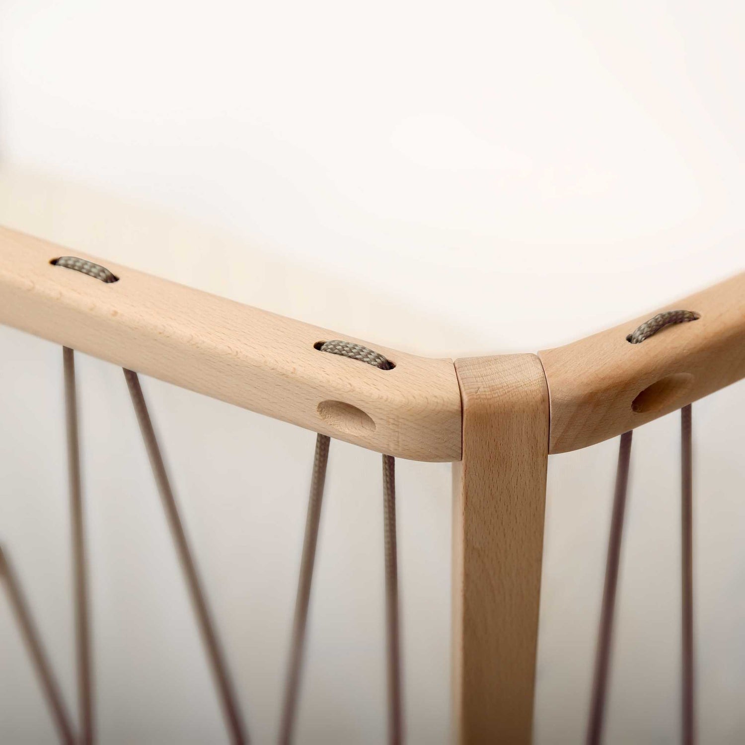 Das KIMI-Bett verfügt über Schnürsenkel anstelle von Gitterstäben, was nicht nur für Leichtigkeit, sondern auch für mehr Sicherheit sorgt. So kann sich das Baby nicht zwischen den Stäben einklemmen.
