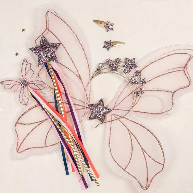 Goldener Stab mit farbigen Bändern und farbenfrohen, glitzernden Feenflügeln. Länge ca. 37 cm
