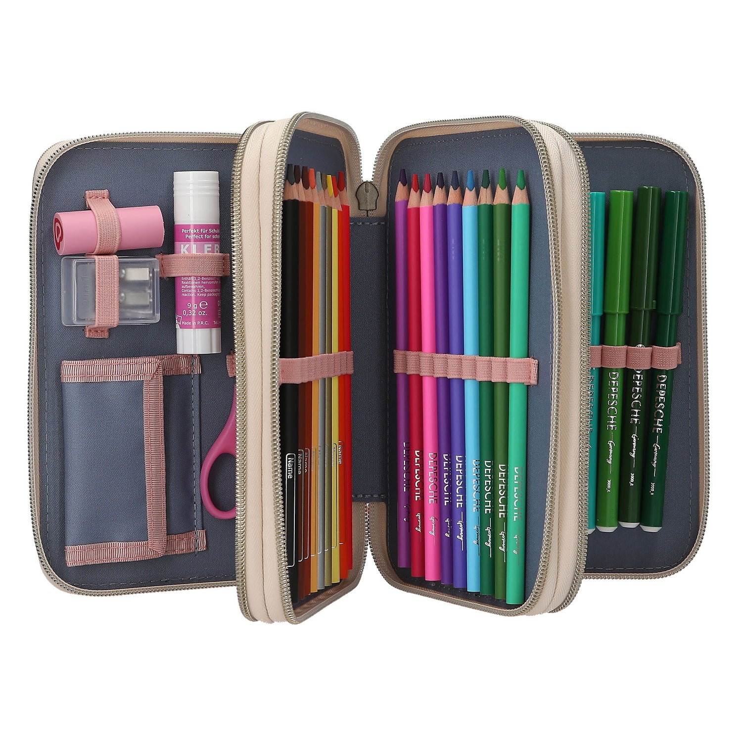 Die beigefarbene 3-Fach-Federtasche von Miss Melody ist wie ein wahr gewordener Pferde-Traum: Auf der Front ist ein großes Motiv von einem weißen Pferd in einer Mohnblumen-Wiese. Mit großem textilem Anfasser am Reißverschluss. Die drei separaten Fächer sind komplett gefüllt mit je 18 Bunt- und Filzstiften, 2 Bleistiften, Anspitzer, Radierer, Lineal, Schere, Klebestift und einem kleinen Klett-Täschchen. Hauptmaterial: 100 Prozent Polyamid; Front: 100 Prozent Polyester; Besatz 100 Prozent PU