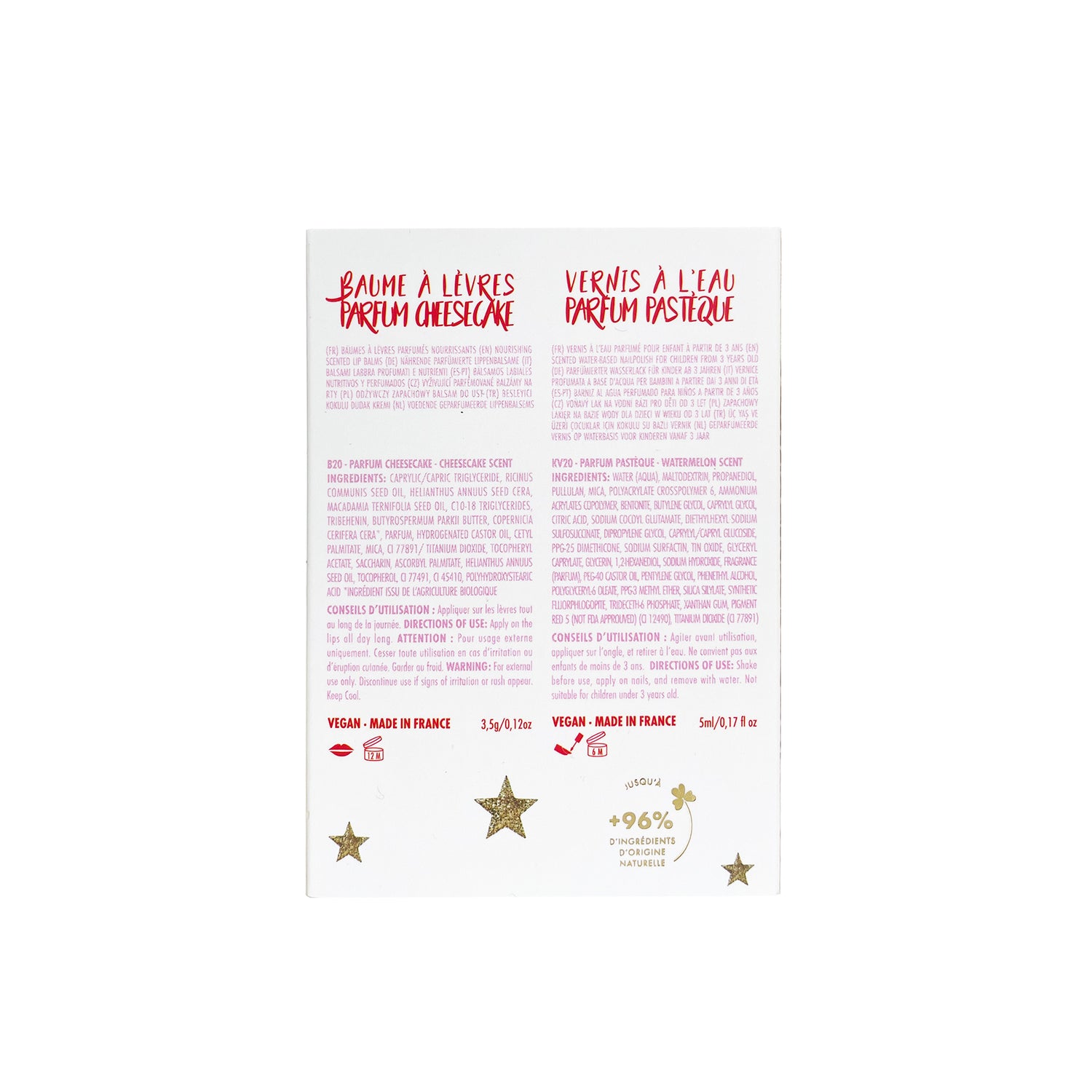 Das Geschenkset von INUWET besteht aus einem pflegenden Lippenbalsam mit Käsekuchenduft und einem wasserbasierten Nagellack für Kinder mit Wassermelonenduft. Der Lippenbalsam ist reich an Sheabutter, Macadamiaöl und Bio-Carnaubawachs, um Ihre Lippen zu pflegen, zu reparieren, weich zu machen und zu schützen. Er enthält 95,7 % natürliche Inhaltsstoffe und kann den ganzen Tag über aufgetragen werden. Vor dem Lippenstift kann er auch als Make-up-Grundlage verwendet werden. Die Nagellacke von INUWET werden in Frankreich hergestellt, sind vegan und bestehen zu 82 % aus Wasser sowie bis zu 97 % aus natürlichen Inhaltsstoffen. Die Formeln sind natürlich, vegan und in Frankreich hergestellt. Der Nagellack lässt sich leicht mit Wasser entfernen und bietet eine intensive Farbe sowie einen köstlichen Duft. Für den Nagellack sollten Sie die Flasche gut schütteln und sicherstellen, dass sie fest verschlossen ist. Tragen Sie je nach gewünschtem Finish ein oder zwei Schichten Nagellack auf und lassen Sie ihn 3 Minuten trocknen. Für einen kosmischen Touch können Sie den Sternen-Topcoat auftragen, um Ihren Nägeln mehr Spaß und Magie zu verleihen. Das Entfernen des Nagellacks ist einfach: Halten Sie Ihre Hände unter warmes Wasser. Die Inhaltsstoffe des Lippenbalsams umfassen unter anderem Caprylic/Capric Triglyceride, Ricinus Communis Seed Oil, Macadamia Ternifolia Seed Oil, Butyrospermum Parkii Butter und Tocopherylacetat. Der Nagellack für Kinder enthält Wasser, Maltodextrin, synthetisches Fluorphlogopit, Glyzerin, Zitronensäure und verschiedene Farbpigmente. Das Lippenbalsam & Nagellack Set von INUWET bietet eine natürliche Pflege für Lippen und Nägel, mit intensiven Farben und köstlichen Düften. Perfekt als Geschenk für Kinder oder zum Verwöhnen Ihrer eigenen Lippen und Nägel.