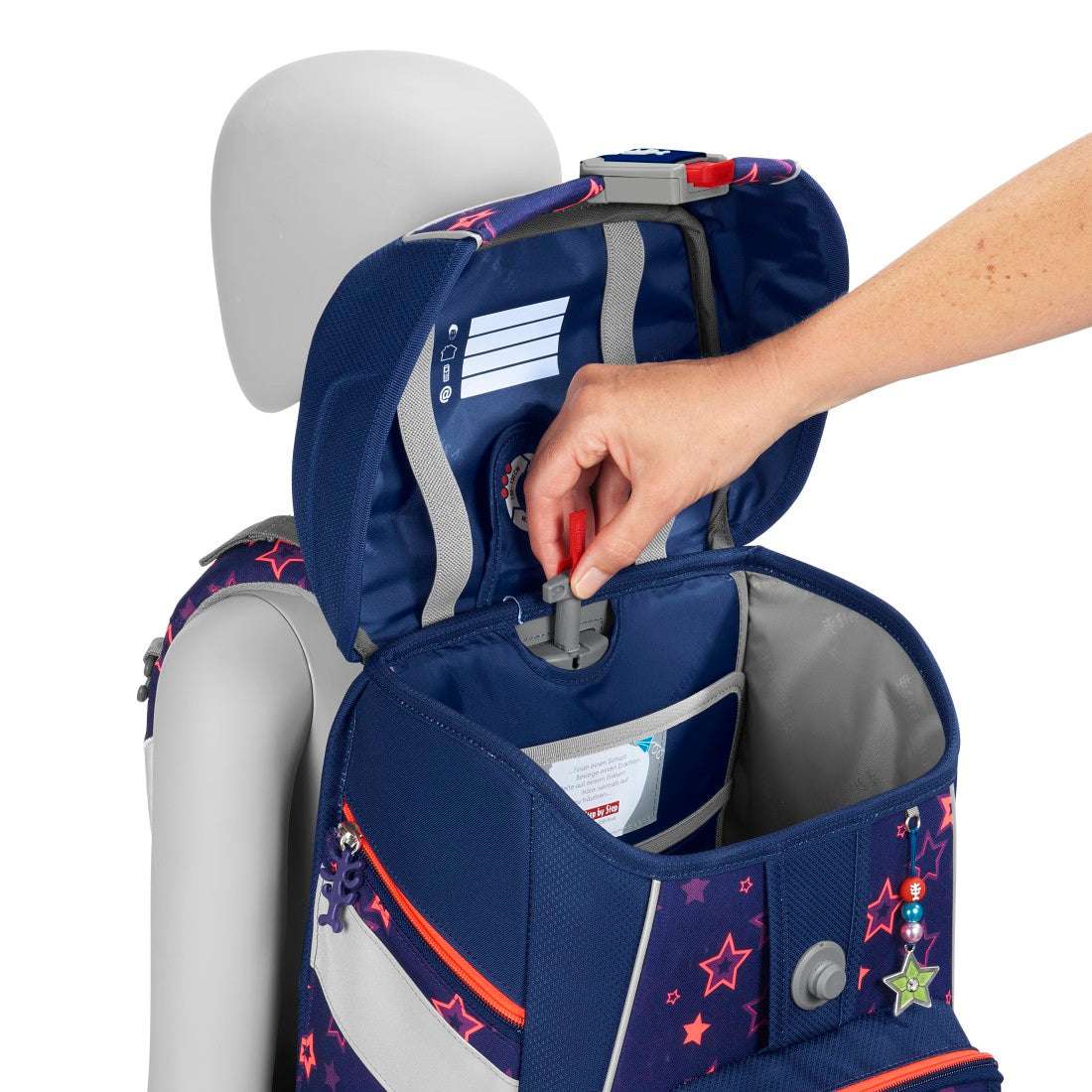 Strahlend und sicher zur Schule - Neonfarbene Highlights, reflektierende Elemente sowie Glow in the Dark-Motive machen die Special Edition SPACE SHINE zu einem gut sichtbaren Begleiter auf dem Schulweg. Der geräumige Schulranzen SPACE von Step by Step ist das Allround-Talent für die Grundschule - alles dabei für den perfekten Schulalltag. In dem großen Hauptfach kommen alle Arbeits- und Schreibhefte unter. Das extra Bücherfach nach am Rücken sorgt für eine optimale Gewichtsverteilung und Ordnung im Schulranzen. In der isolierten Fronttasche bleibt die Lunchbox kühl und warm, ohne dabei in den Innenraum zu drücken. Dank Auslaufösen läuft auch nichts in das Schulranzen-Innere. Die Seitentaschen werden mit Klettverschluss erweitert oder angelegt. Auslaufösen halten Flüssigkeiten vom Ranzen-Inneren fern. Auf der Deckel-Innenseite befinden sich Gummibänder zur optionalen Fixierung des Federmäppchens. So hat es seinen festen Platz, für mehr Organisation im Schulranzen. Der Turnbeutel lässt sich einfach mit Druckknöpfen und Schlaufe am Schulranzen befestigen. So sind die Hände auf dem Schulweg frei und der Turnbeutel kann nicht verloren gehen. Mit dem gepolsterten Tragegriff kann der Schulranzen bequem in der Hand getragen werden, z. B. auf dem Weg zum Bus oder zum Auto. Mit dem EASY GROW SYSTEM lässt sich die Höhe der Schultergurte sowie die Rückenlänge des Schulranzens direkt auf dem Kinderrücken von 100 bis 150 cm Körpergröße individuell anpassen. Der höhenverstellbare Brustgurt sowie der Hüftgurt stellen sicher, dass das Gewicht des Schulranzens von den Schultern genommen und auf den ganzen Körper verteilt wird. Der Brust- und Hüftgurt ist bei Bedarf auch abnehmbar. Die stabile, wasserdichte Bodenplatte schützt vor Schmutz und Nässe. Die MAGIC MAGS machen den Ranzen bunt und individuell: die wechselbaren Motive und Anhänger lassen sich schnell und einfach austauschen.