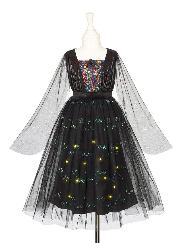 funkelnde Lichter versteckt! Kleid Agatha besteht aus 100 % Polyester. Die Rocklänge beträgt bei der Größe 98/104 ca. 46 cm (3–4 Jahre). Das perfekte Outfit für die nächste Halloweenparty! Pflegehinweis: Ausschließlich sanfte Handwäsche. Achtung: Nicht für Kinder unter 3 Jahren geeignet! Bitte von Feuer fernhalten!
