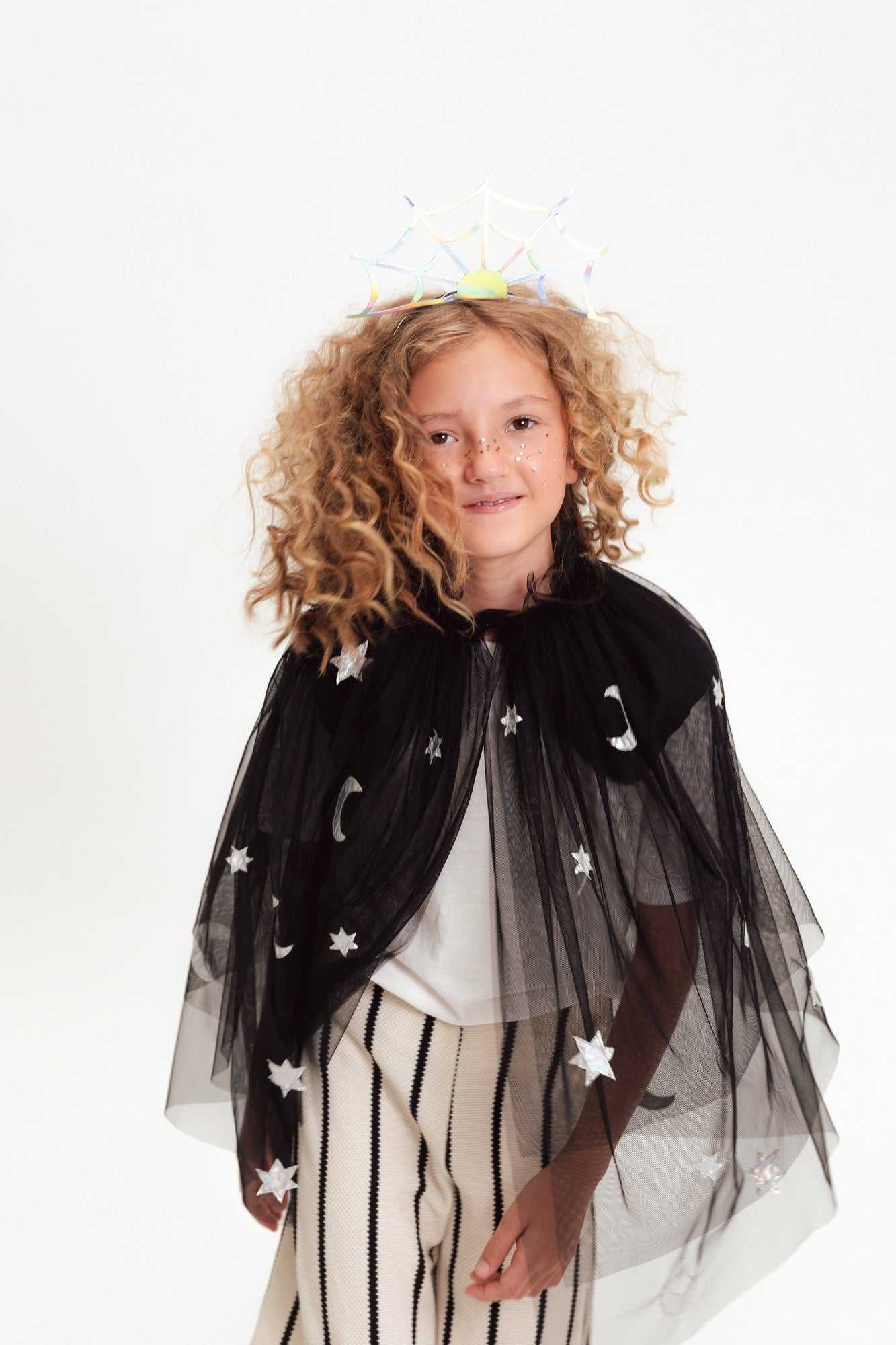 Der schwarze Umhang hat silberne Elemente , ist passend für Kinder von 3-7 Jahre und kann schaurig schön kombiniert werden.