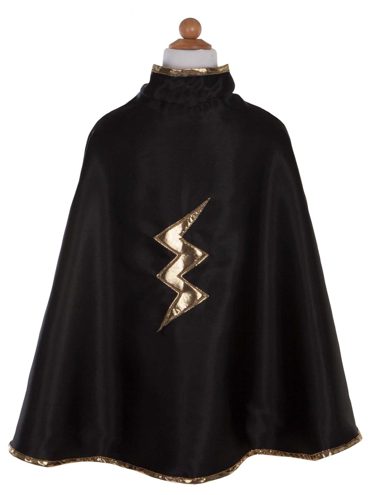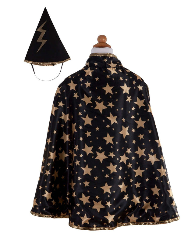 Der Wende-Umhang hat eine schwarze Satinseite mit einem goldenen Blitz und auf der anderen Seite unzählige goldene Sterne.
