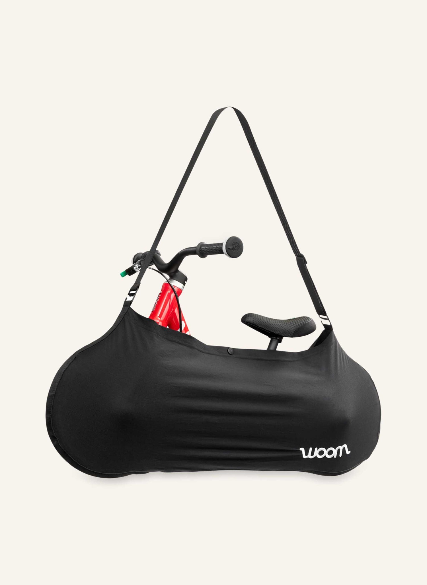 Kompakt verstaubare Tragetasche von Woom, mit der sowohl Laufräder als auch Fahrräder bis 16 Zoll komfortabel und einfach getragen werden können.