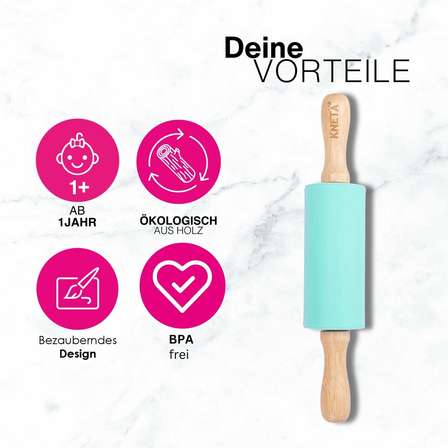 Der KNETÄ Rolli in wunderschönem Mint ist das ideale Zubehör zum Spielen mit Knetmasse. Das hochwertige, kleine Nudelholz besteht aus nachwachsenden Rohstoffen und eignet sich für Kinder ab einem Jahr. Durch das Formen und Ausrollen von Knete werden kleine, spielend leichte Erfolgserlebnisse geschaffen. Nach dem Spielen, das Nudelholz reinigen. Danach gut Trocknen lassen.