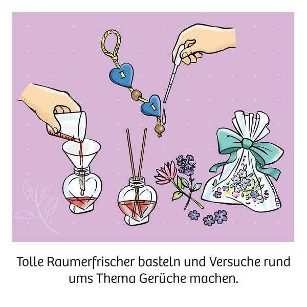 Mit diesem einzigartigen Experimentierkasten können Kinder ab acht Jahren ihre ganz eigenen Raumdüfte kreieren und dabei in die spannende Welt der Parfüm-Herstellung eintauchen. Dank kreativer Zusatzexperimente, Duft-Spielen und DIY-Projekten lässt sich außerdem die Welt des Riechens ganz neu entdecken und tolle Dekorationen fürs eigene Kinderzimmer herstellen. Mit diesem Set sind dem Ausprobieren keine Grenzen gesetzt: es enthält neben einer Raumduftbasis, flüssigem Glycerin und einem hübschen Deko-Flakon auch Bastelartikel sowie Experimentierzubehör wie Messbecher, Trichter, Pipetten und Spatel. Mit nur wenigen haushaltsüblichen Zusatzmaterialien lassen sich außerdem viele weitere Duft-Projekte realisieren.