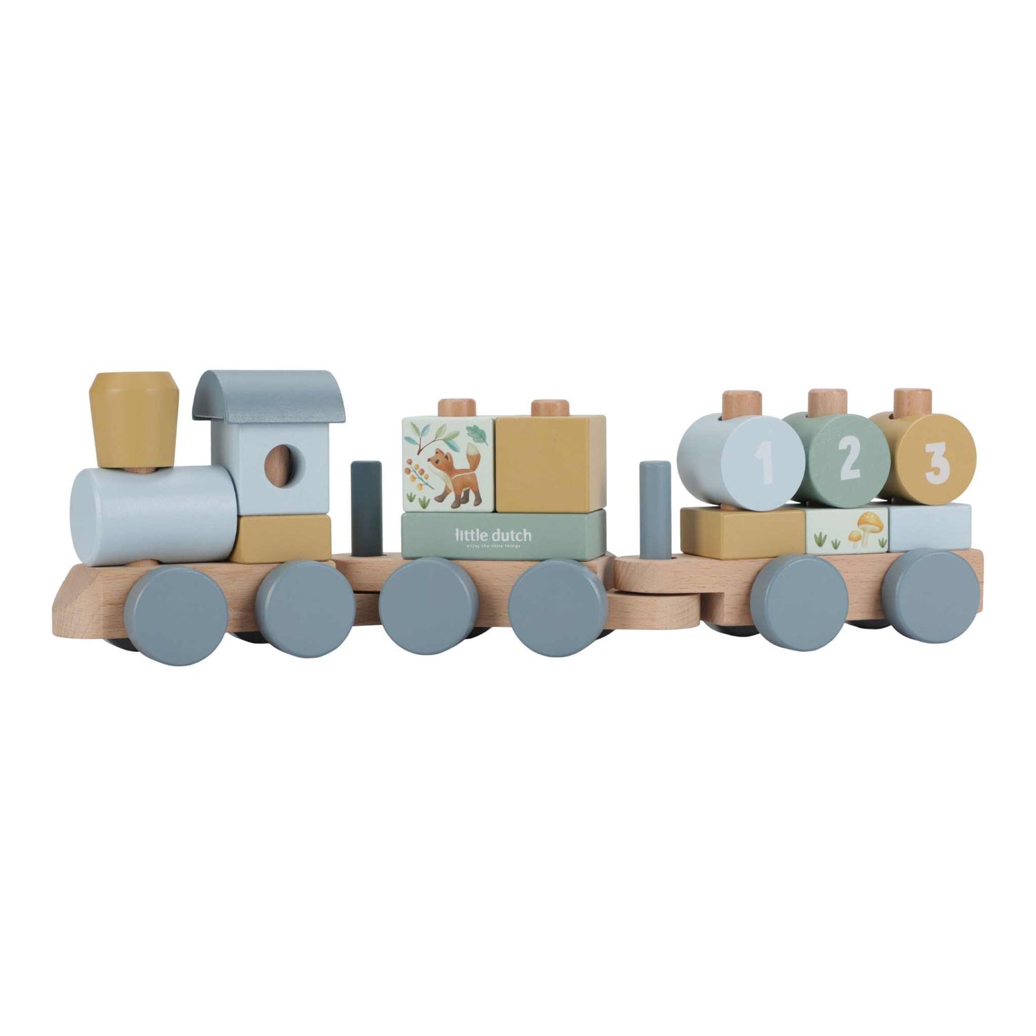 Die Blöcke sind mit verschiedenen Motiven verziert, darunter Schätze aus der Natur, freundliche Waldfreunde und die Zahlen 1, 2 und 3.