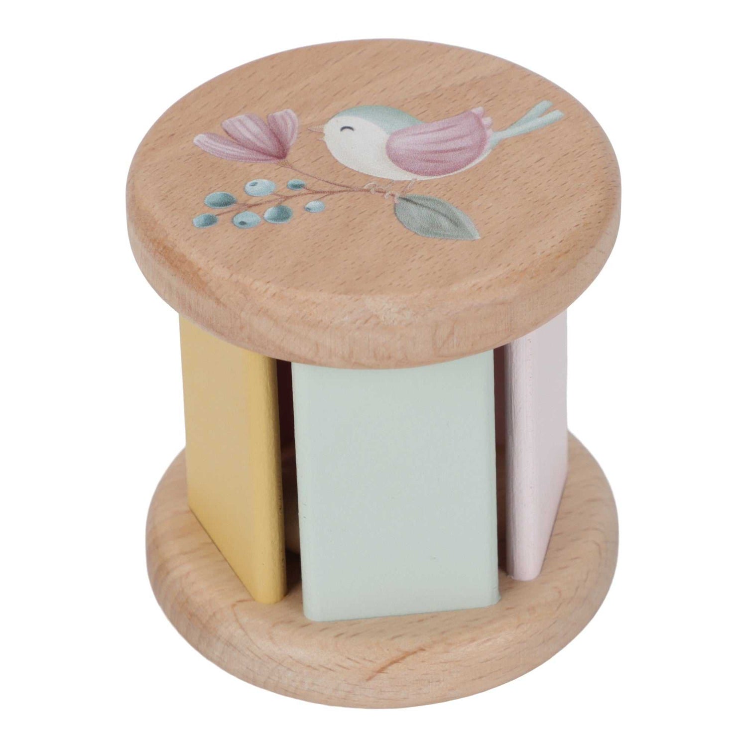 In der Geschenkbox befinden sich drei entzückende Holzartikel. Zunächst gibt es eine Roll-Rassel, die dazu einlädt, sie zu greifen und zu schütteln, um die Glocke läuten zu hören.