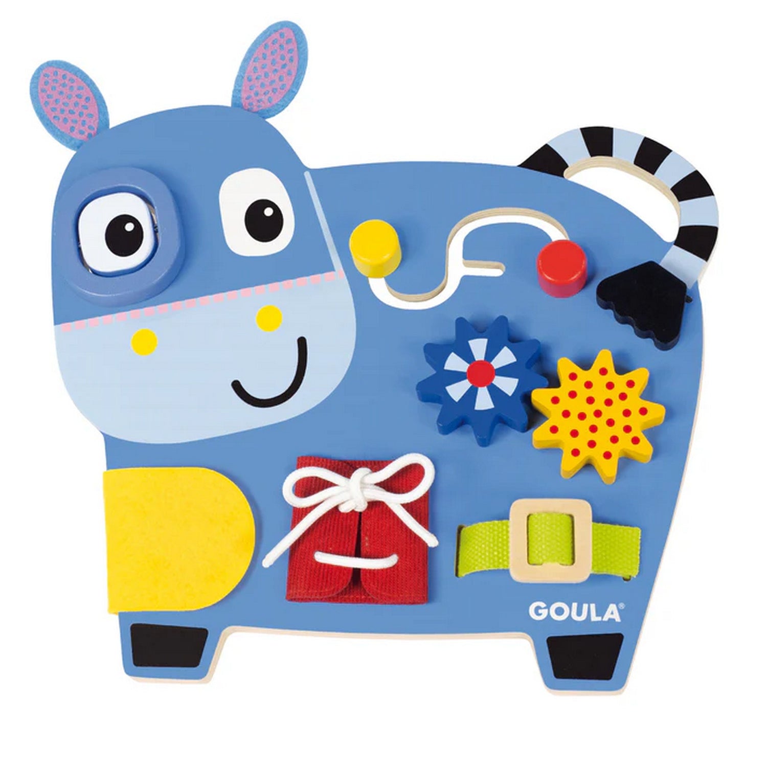 Holz-Aktivitätstisch mit Griff, weichen Ohren, einem blinzelnden Auge, Labyrinth, Überraschungsklappe, zwei drehenden Zahnrädern, einem Gürtel mit Schnalle und verschiedenen Öffnungssystemen wie einem Klettverschluss und Schnürsenkeln.