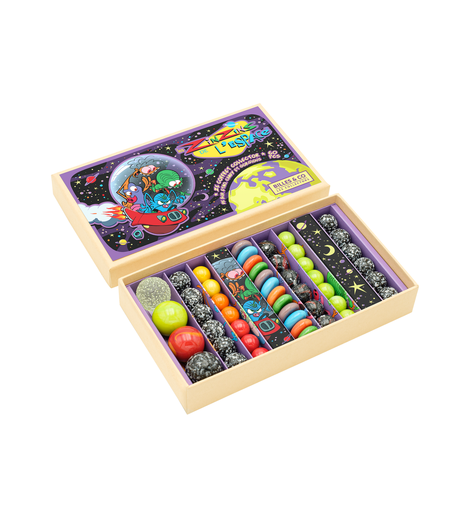 Lernen Sie die Space Goofs von Billes & Co kennen, die außerirdischen Hausbesetzer aus einer anderen Galaxie. Diese Marmor-Sammlerbox ist in den Farben der Zeichentrickserie des berühmten französischen Animationsstudios Xilam gehalten.