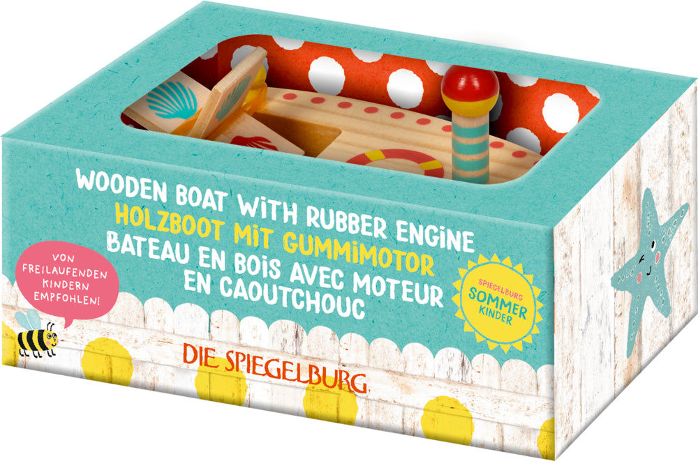 Einfach das Holzrad mit dem Gummi aufziehen und schon flitzt das Boot über das Wasser.