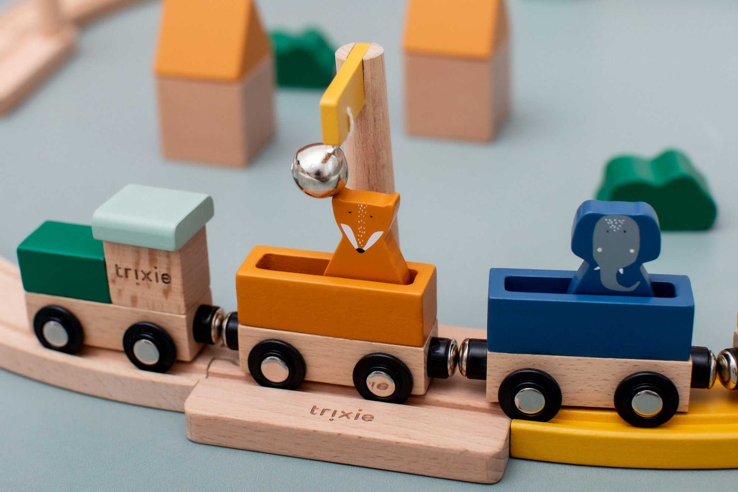 An Bord des Tierzuges von Trixie Baby, um ein paar tolle Runden auf der Zugstrecke zu drehen.