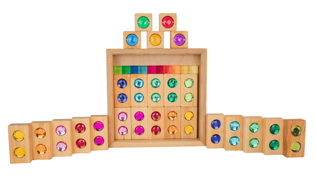 Der Holzkasten, in dem die 45 Teile sicher aufbewahrt werden können, misst 29 x 26,5 x 6 cm. Die Holzquader haben die Maße 10 x 5 x 2,5 cm, die Facettenklötze 5 x 5 x 2,5 cm und die Lichtbauwürfel 2,5 x 2,5 x 2,5 cm. Durch die unterschiedlichen Formen und Größen der Bauelemente können Kinder vielfältige Strukturen erschaffen und dabei spielerisch ihre motorischen Fähigkeiten sowie ihr räumliches Denken fördern.