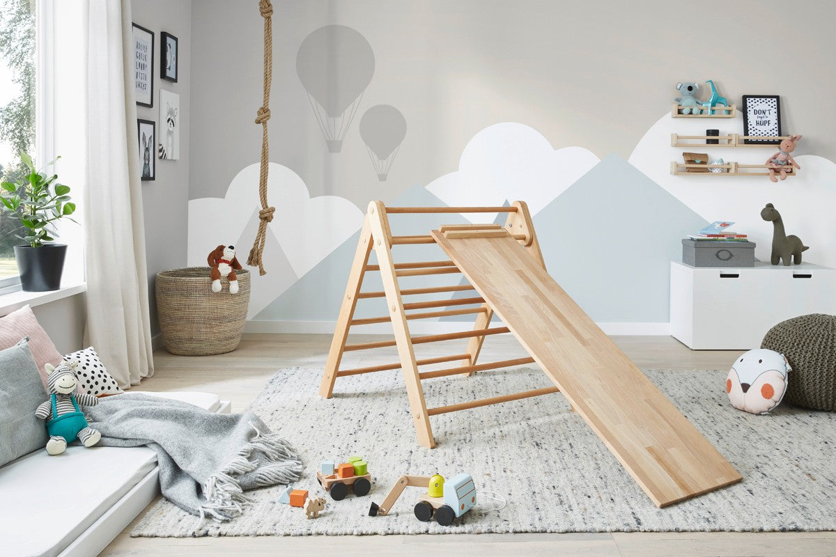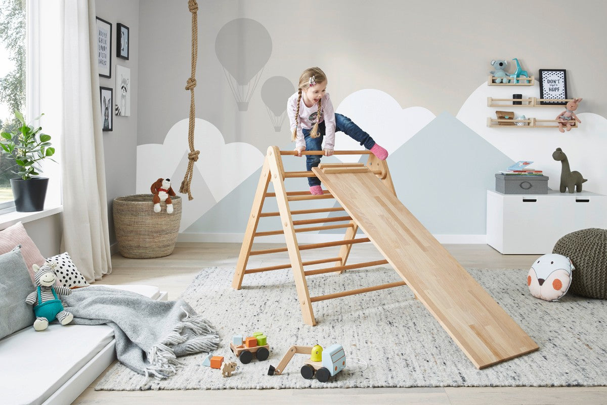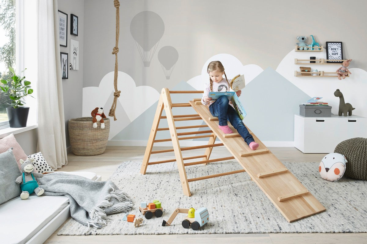 Mit dem passendem Rutschbrett und dem Sprossenbaum, können Sie einen tollen Indoor- Spielplatz gestalten.