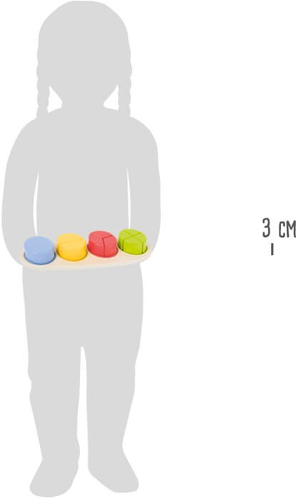 Bei dem kniffeligen Legespiel wird der große Zylinder in drei Stufen in immer kleinere Teile geteilt, die dann in die passende Form und Farbe sortiert werden müssen.