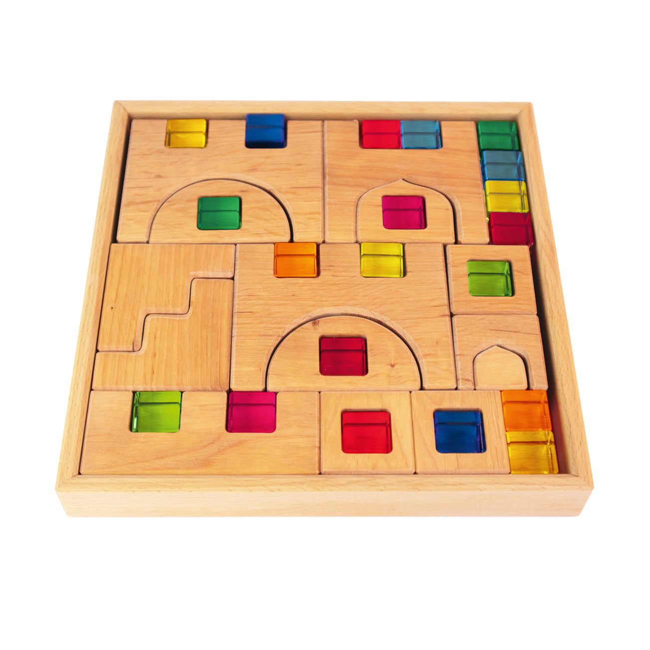 Das Bauspiel Lichtbauschloss ist ein faszinierendes Konstruktionsspielzeug, das Kinder ab 3 Jahren in eine Welt voller leuchtender Baukunst entführt. Das Set besteht aus insgesamt 34 Bauelementen, darunter 20 farbige Lichtbauwürfel und 14 massive Holzbausteine in verschiedenen Formen. Die Kombination von edlem Erlenholz und strahlendem Acryl in zehn intensiven Farben erzeugt faszinierende Lichtspiele und ermöglicht unzählige kreative Konstruktionen.