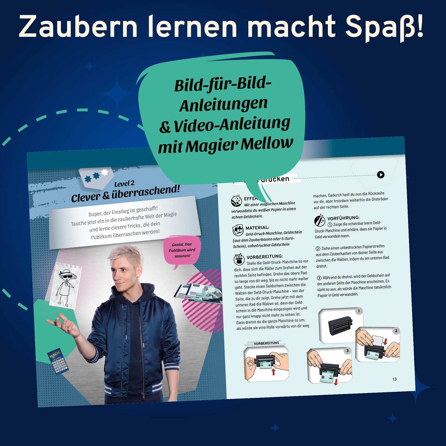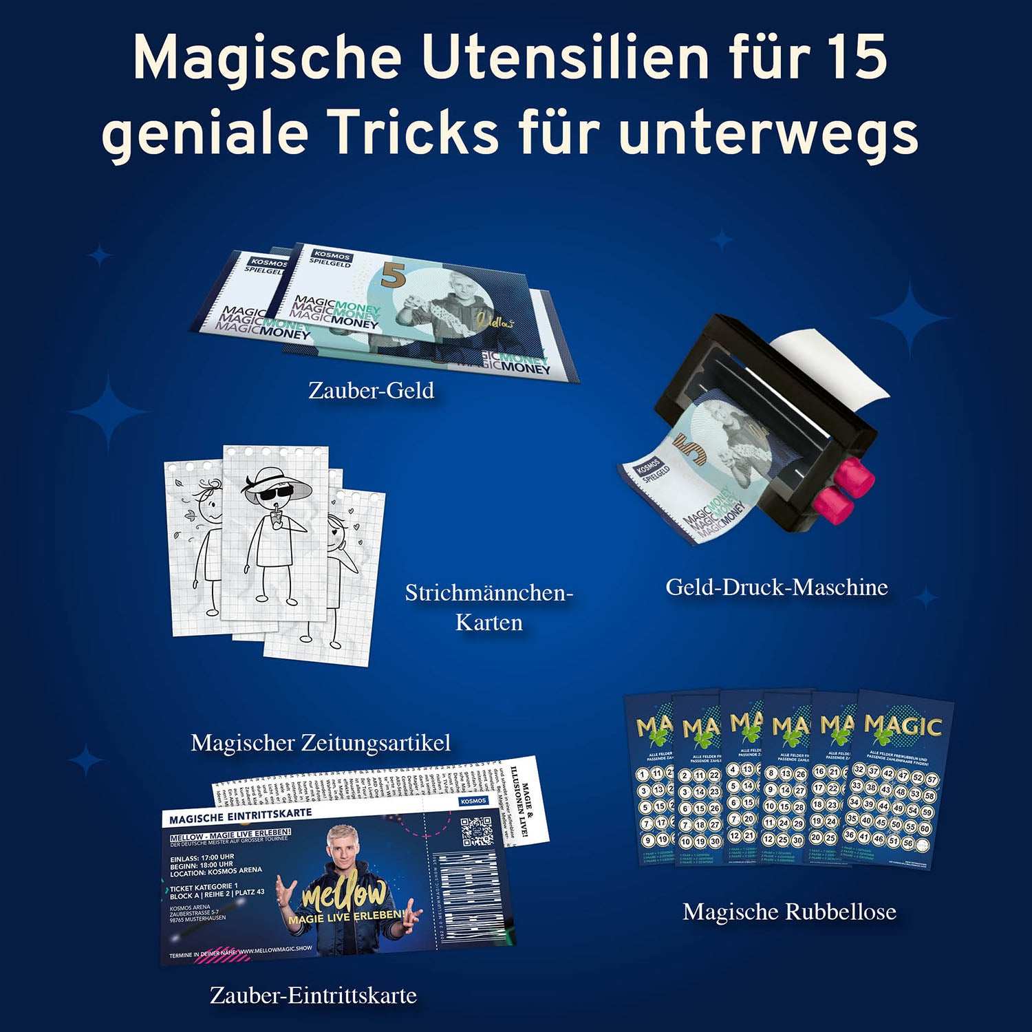 15 geniale Tricks für unterwegs! Geld mit der Geld-Druck-Maschine vermehren und unglaubliche Zaubertricks mit Karten vorführen: Mit diesem Zauberset verblüffen Kinder ab acht Jahren ihre Freunde, Geschwister und Eltern. Die farbig gestaltete Anleitung führt sie Schritt für Schritt durch eine coole Show. Wie die Illusionen gelingen, zeigt Profi-Magier Mellow in exklusiven Online-Tutorials. Überraschung auf dem nächsten Kindergeburtstag und auf dem Schulhof garantiert! Im handlichen Format ist der Zauberkasten auch ein ideales Mitbringsel.