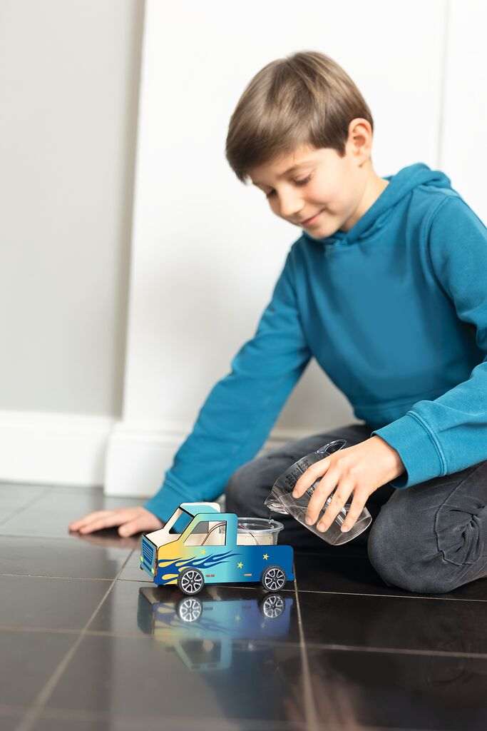 Der Bausatz ermöglicht es Kindern, ein Elektro-Auto zu bauen, das mit Salzwasser als Antrieb funktioniert. Dabei wird auf Klebstoff verzichtet, was den Zusammenbau kinderleicht macht.