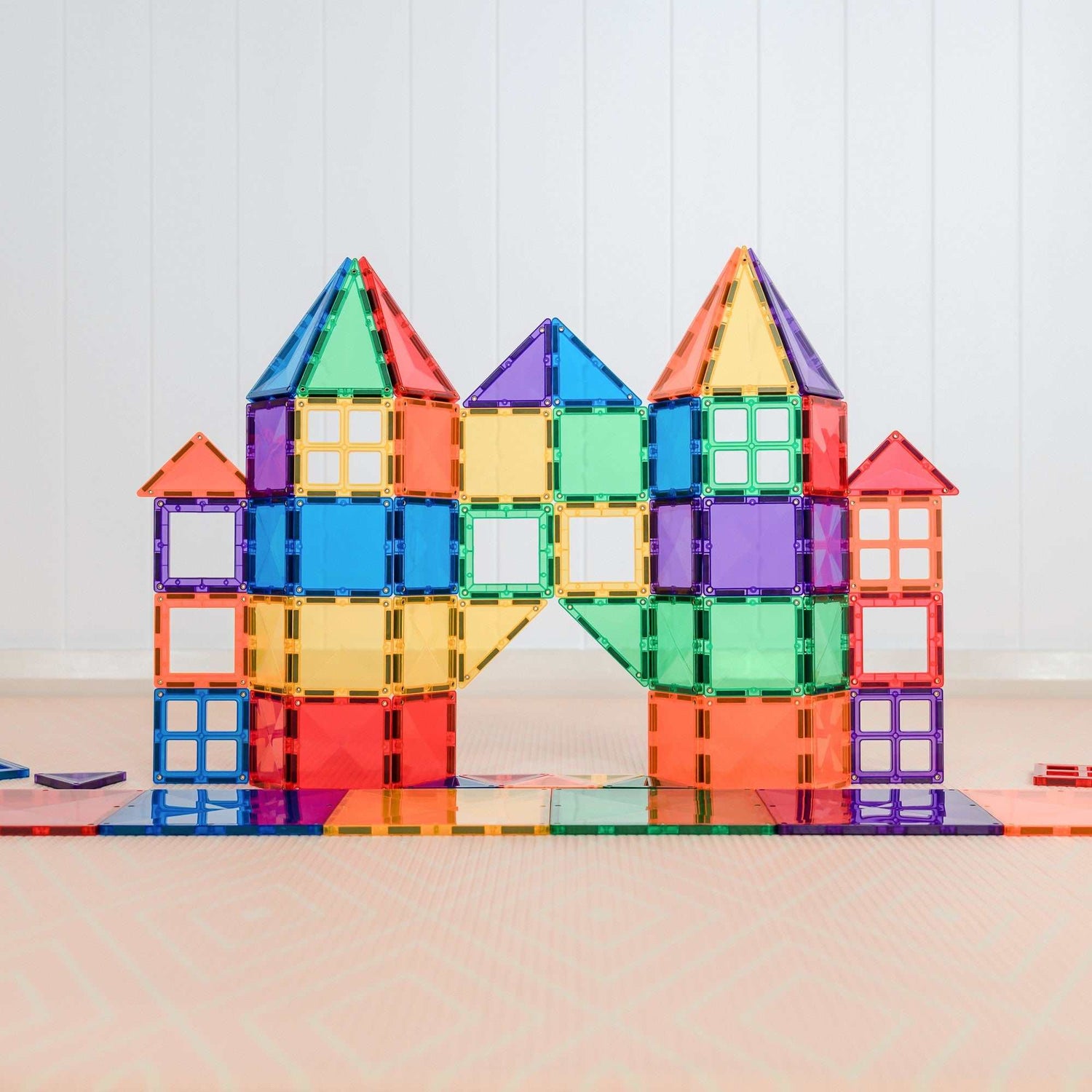 Dieses Set präsentiert eine vielseitige Auswahl magnetischer Bausteine in lebendigen Regenbogenfarben.